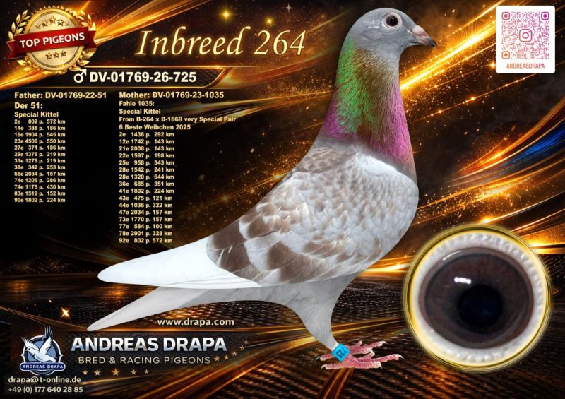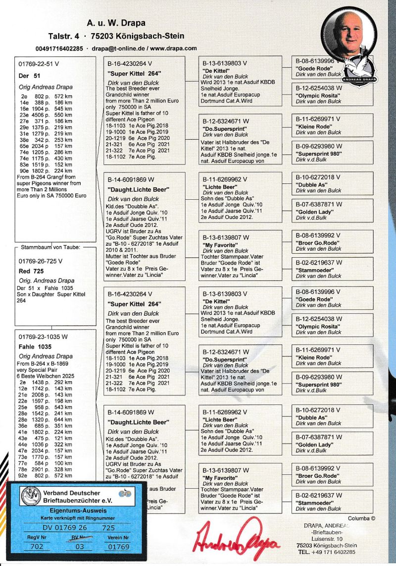 ***UWAGA PODBICIE NA TEJ AUKCJI WYNOSI 50 ZŁ*** Oryginalny gołąb z hodowli Andreasa Drapy. Szczegóły pochodzenia w rodowodzie. Gołąb jest własnością Andreasa Drapy, a w tej chwili znajduje się już w Polsce u kol. Robert Grochowskiego, gdzie można go obejrzeć przed zakończeniem aukcji po wcześniejszym kontakcie telefonicznym.