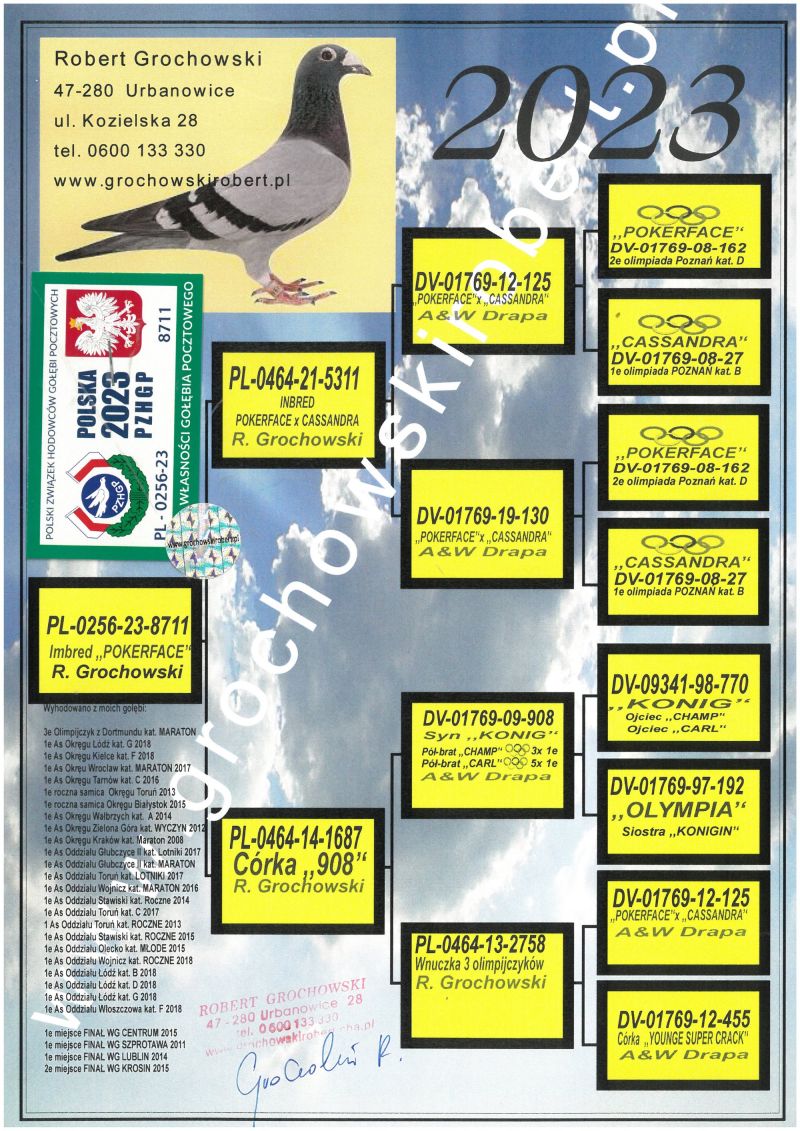 Orginalny gołąb z hodowli Roberta Grochowskiego. Więcej informacji na temat pochodzenia w rodowodzie. Możliwość wysyłki gołębia po wygranej aukcji po wcześniejszej wpłacie na konto.