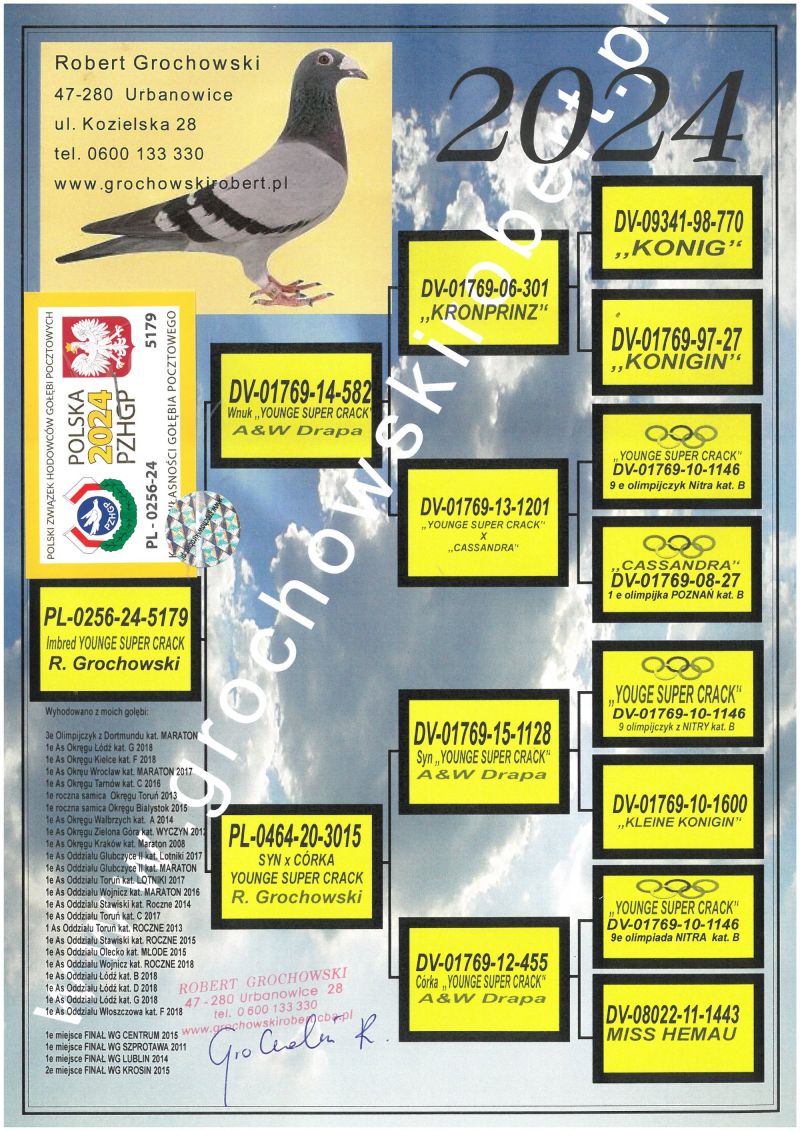 Orginalny gołąb z hodowli Roberta Grochowskiego. Więcej informacji na temat pochodzenia w rodowodzie. Możliwość wysyłki gołębia po wygranej aukcji po wcześniejszej wpłacie na konto.