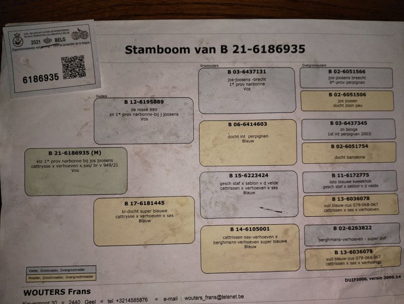 Samiec rozpłodowy Belg z hodowli Fransa Woutersa. Szczegóły w rodowodzie. Wysyłka gołębia po wpłacie wylicytowanej kwoty + koszt wysyłki 200zł. Możliwy odbiór osobisty.