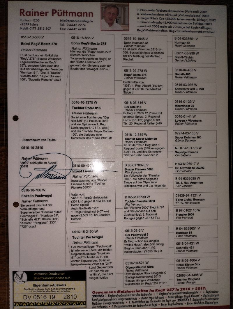 Samica DV 0516 19 2810 z hodowli Rainer Puttmann. Szczegóły w rodowodzie.