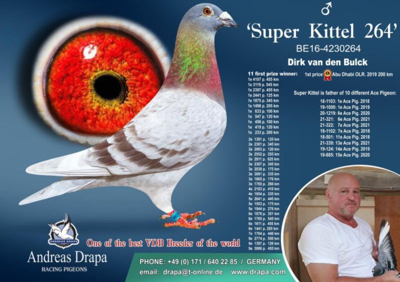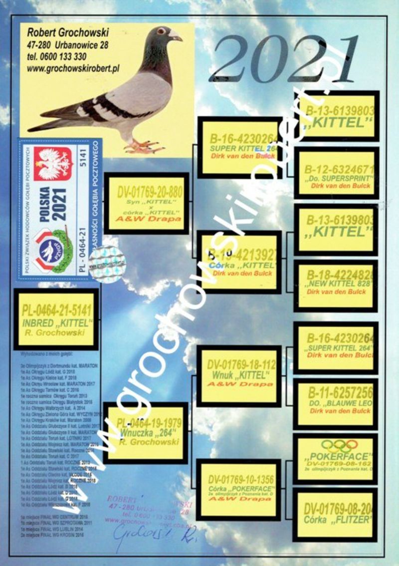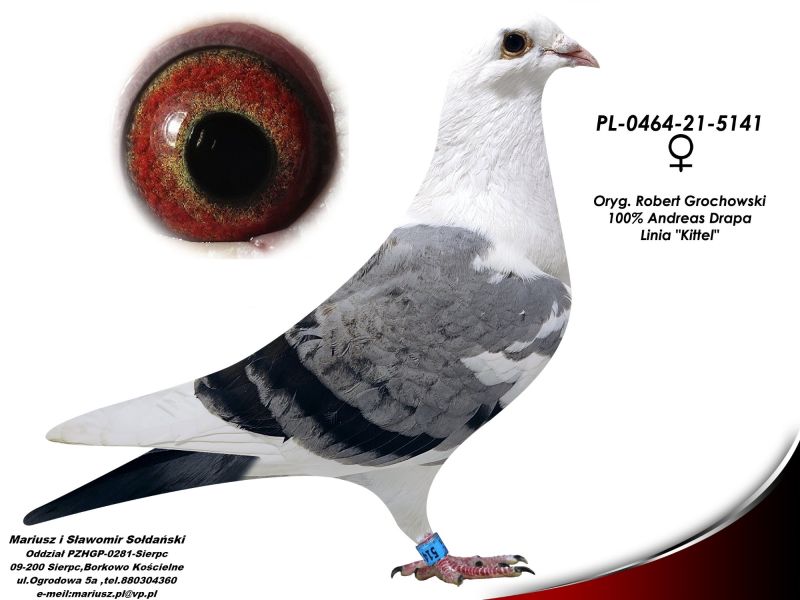 Oryginalny gołąb z hodowli Robert Grochowski samica. Gołąbek pochodzi po oryginalnych gołębiach Andreasa Drapy z Linii "Kittel', "Pokerface", "Olimpic Rosita" Więcej informacji o gołębiu pod nr tel. Nasze wyniki w Mistrzostwie Polski 2018: 6 Miejsce w Intermistrzostwie Międzynarodowym - coeff. 151,73; 23 Miejsce GMP - 1874,73; 29 Miejsce Kat.B - coeff. 86,45. 1 Miejsce Gołąb Średni dystans-Konkurs Redakcji "Hodowca", 1 Miejsce Kat."B"-Konkurs Redakcji "Dobry Lot", 3 Miejsce Kat."D"-Konkurs Redakcji "Dobry Lot", 2 Miejsce "Mistrzostwo Asów Allround"-Konkurs Redakcji "Dobry Lot", 1 Miejsce Kat."B"-Konkurs Redakcji "Poradnik Hodowcy". 2019-Oddział Sierpc: Typowane Mistrz, Open I-vce Mistrz, Open 50 II-V-ce Mistrz, 1 i 3 Lotnik Roczny, Kat. A II V-ce Mistrz, Kat. B II V-ce Mistrz, Kat. D II V-ce Mistrz, Kat. GMP I v-Ce Mistrz, Kat. Inter. I V-ce Mistrz, Super. I V-ce Mistrz. Okręg Płock: II V-ce Mistrz Supermistrzostwo, I V-ce Mistrz GMP, II Lotnik. kat. B. 10 Gołębi w Reprezentacji Okręgu na Wystawę Ogółnopolską 2020. 2 AS POLSKI SPORT „B”-14,62 coef. 2020-Oddział Sierpc: Typowane Mistrz, Open I-vce Mistrz, Open 50 I-V-ce Mistrz, 1 Lotniczka Roczna, Kat. C Mistrz, Kat. M II V-ce Mistrz, Kat. D II V-ce Mistrz, Kat. GMP Mistrz, Kat. Inter. II V-ce Mistrz, Mistrz. Okręg Płock: Kat. GMP Mistrz , Kat.Roczne Mistrz, Kat. C-I Vce Mistrz , Kat. M - I Vce Mistrz Mistrz.Regionu I Łódż- V-ce Mistrz „Roczne” 2021- Supermistrz Oddziału Sierpc Mistrz Okręgu Płock Kat." Maraton" Supermistrz Okręgu Płock