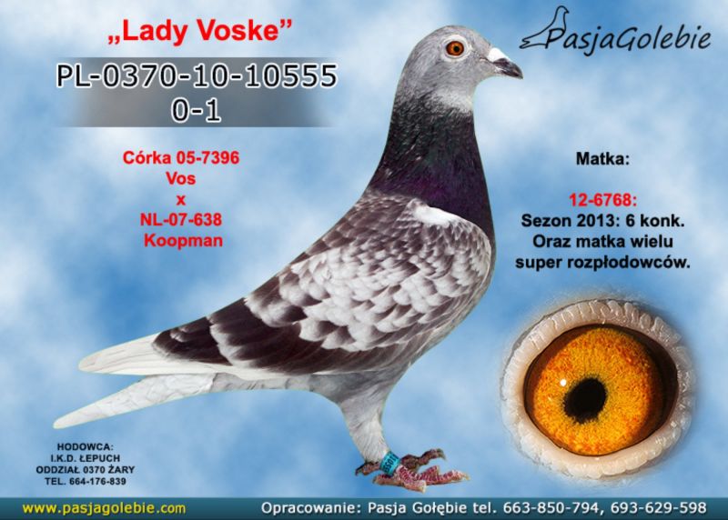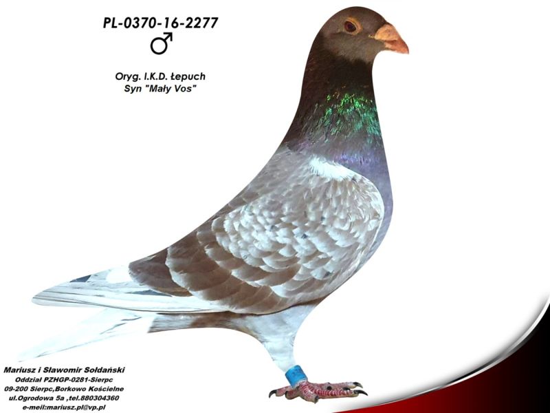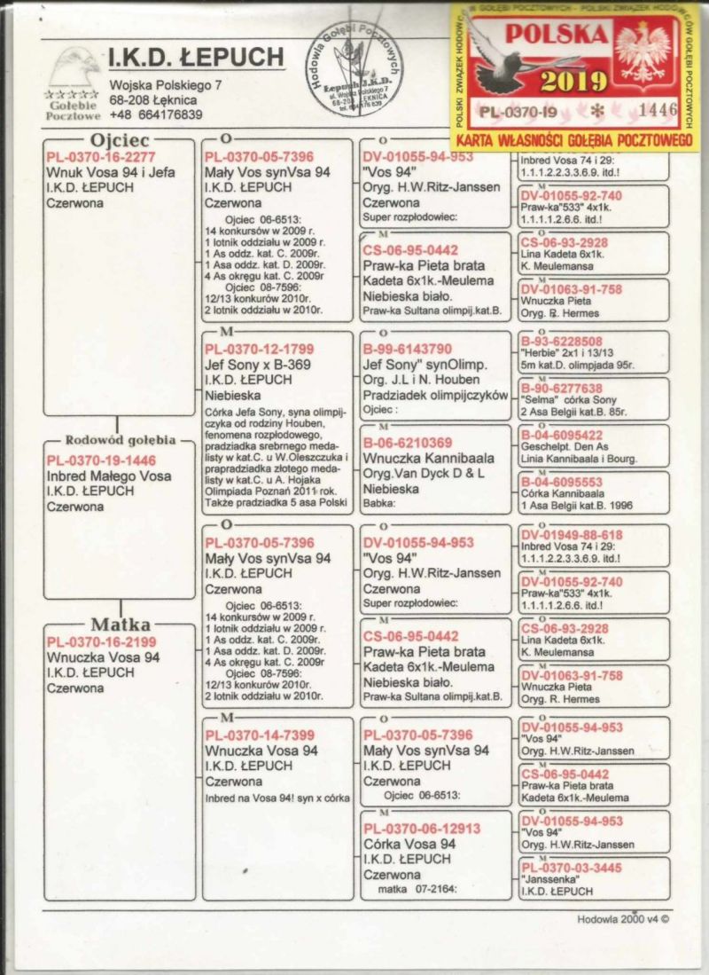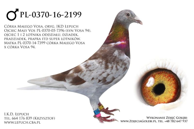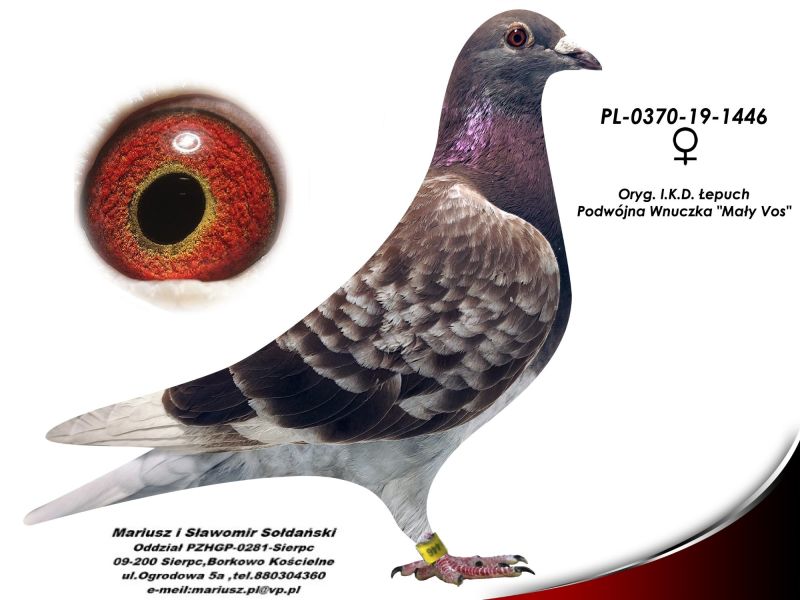 Oryginalna samica z hodowli I.K.D. Łepuch super Linia "Vos 94" (Podwójna Wnuczka Mały Vos) .Więcej informacji o gołębiu pod nr tel. i poniższych materiałach. Więcej informacji o gołębiu pod nr tel. i poniższych materiałach. Nasze wyniki w Mistrzostwie Polski 2018: 6 Miejsce w Intermistrzostwie Międzynarodowym - coeff. 151,73; 23 Miejsce GMP - 1874,73; 29 Miejsce Kat.B - coeff. 86,45. 1 Miejsce Gołąb Średni dystans-Konkurs Redakcji "Hodowca", 1 Miejsce Kat."B"-Konkurs Redakcji "Dobry Lot", 3 Miejsce Kat."D"-Konkurs Redakcji "Dobry Lot", 2 Miejsce "Mistrzostwo Asów Allround"-Konkurs Redakcji "Dobry Lot", 1 Miejsce Kat."B"-Konkurs Redakcji "Poradnik Hodowcy". 2019-Oddział Sierpc: Typowane Mistrz, Open I-vce Mistrz, Open 50 II-V-ce Mistrz, 1 i 3 Lotnik Roczny, Kat. A II V-ce Mistrz, Kat. B II V-ce Mistrz, Kat. D II V-ce Mistrz, Kat. GMP I v-Ce Mistrz, Kat. Inter. I V-ce Mistrz, Super. I V-ce Mistrz. Okręg Płock: II V-ce Mistrz Supermistrzostwo, I V-ce Mistrz GMP, II Lotnik. kat. B. 10 Gołębi w Reprezentacji Okręgu na Wystawę Ogółnopolską 2020. 2 AS POLSKI SPORT „B”-14,62 coef. 2020-Oddział Sierpc: Typowane Mistrz, Open I-vce Mistrz, Open 50 I-V-ce Mistrz, 1 Lotniczka Roczna, Kat. C Mistrz, Kat. M II V-ce Mistrz, Kat. D II V-ce Mistrz, Kat. GMP Mistrz, Kat. Inter. II V-ce Mistrz, Mistrz. Okręg Płock: Kat. GMP Mistrz , Kat.Roczne Mistrz, Kat. C-I Vce Mistrz , Kat. M - I Vce Mistrz Mistrz.Regionu I Łódż- V-ce Mistrz „Roczne” 2021- Supermistrz Oddziału Sierpc Mistrz Okręgu Płock Kat." Maraton" Supermistrz Okręgu Płock,2022 6 gołębi w reprezentacji Okręgu Płock na Wystawę Ogólnopolską.2022- II Supermistrz Oddziału Sierpc, 8 x V-ce Mistrz Oddziału. 1 AS WG Kaszuby 2022, 2 drużyna WG Kosakowo 2022, 4 AS WG Kosakowo. 6 AS WG Roztocze 2022. 6 gołębi w reprezentacji Okręgu Płock na Wystawę Ogólnopolską 2023. 2022-1 Samica w Polsce PL-0281-17-3077 w Kat. "Supermaraton"- Konkurs Redakcji"Hodowca". 2024 - 10 Miejsce w Polsce w kat. GMP 1 Miejsce Finał Wg Zatoka Puck 3 i 6 As Zatoka Puck