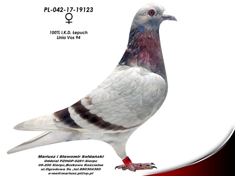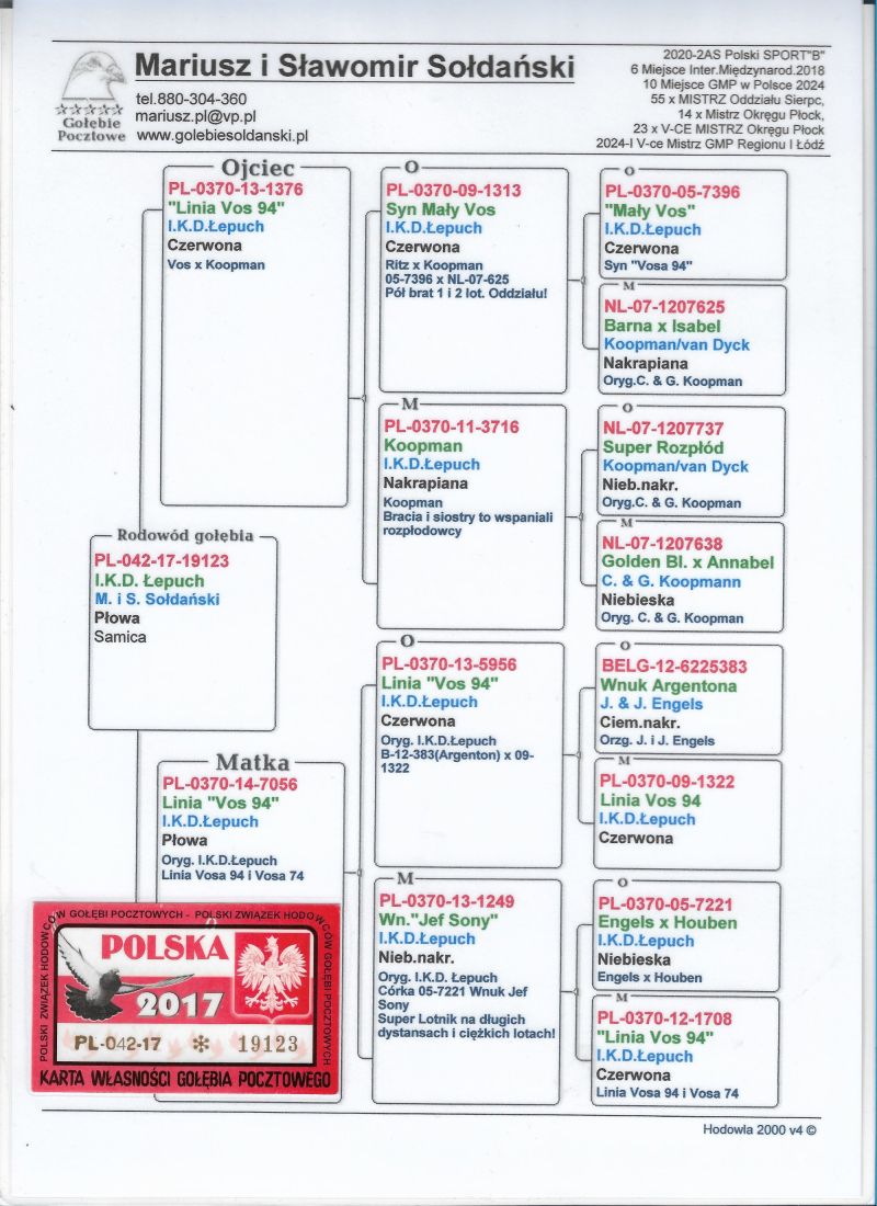 Oryginalna samica z hodowli M. i S. Sołdańscy super Lina Vos 94 I.K.D. Łepuch. Więcej informacji o gołębiu pod nr tel. i poniższych materiałach. Nasze wyniki w Mistrzostwie Polski 2018: 6 Miejsce w Intermistrzostwie Międzynarodowym - coeff. 151,73; 23 Miejsce GMP - 1874,73; 29 Miejsce Kat.B - coeff. 86,45. 1 Miejsce Gołąb Średni dystans-Konkurs Redakcji "Hodowca", 1 Miejsce Kat."B"-Konkurs Redakcji "Dobry Lot", 3 Miejsce Kat."D"-Konkurs Redakcji "Dobry Lot", 2 Miejsce "Mistrzostwo Asów Allround"-Konkurs Redakcji "Dobry Lot", 1 Miejsce Kat."B"-Konkurs Redakcji "Poradnik Hodowcy". 2019-Oddział Sierpc: Typowane Mistrz, Open I-vce Mistrz, Open 50 II-V-ce Mistrz, 1 i 3 Lotnik Roczny, Kat. A II V-ce Mistrz, Kat. B II V-ce Mistrz, Kat. D II V-ce Mistrz, Kat. GMP I v-Ce Mistrz, Kat. Inter. I V-ce Mistrz, Super. I V-ce Mistrz. Okręg Płock: II V-ce Mistrz Supermistrzostwo, I V-ce Mistrz GMP, II Lotnik. kat. B. 10 Gołębi w Reprezentacji Okręgu na Wystawę Ogółnopolską 2020. 2 AS POLSKI SPORT „B”-14,62 coef. 2020-Oddział Sierpc: Typowane Mistrz, Open I-vce Mistrz, Open 50 I-V-ce Mistrz, 1 Lotniczka Roczna, Kat. C Mistrz, Kat. M II V-ce Mistrz, Kat. D II V-ce Mistrz, Kat. GMP Mistrz, Kat. Inter. II V-ce Mistrz, Mistrz. Okręg Płock: Kat. GMP Mistrz , Kat.Roczne Mistrz, Kat. C-I Vce Mistrz , Kat. M - I Vce Mistrz Mistrz.Regionu I Łódż- V-ce Mistrz „Roczne” 2021- Supermistrz Oddziału Sierpc Mistrz Okręgu Płock Kat." Maraton" Supermistrz Okręgu Płock,2022 6 gołębi w reprezentacji Okręgu Płock na Wystawę Ogólnopolską.2022- II Supermistrz Oddziału Sierpc, 8 x V-ce Mistrz Oddziału. 1 AS WG Kaszuby 2022, 2 drużyna WG Kosakowo 2022, 4 AS WG Kosakowo. 6 AS WG Roztocze 2022. 6 gołębi w reprezentacji Okręgu Płock na Wystawę Ogólnopolską 2023. 2022-1 Samica w Polsce PL-0281-17-3077 w Kat. "Supermaraton"- Konkurs Redakcji"
