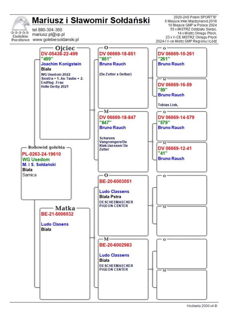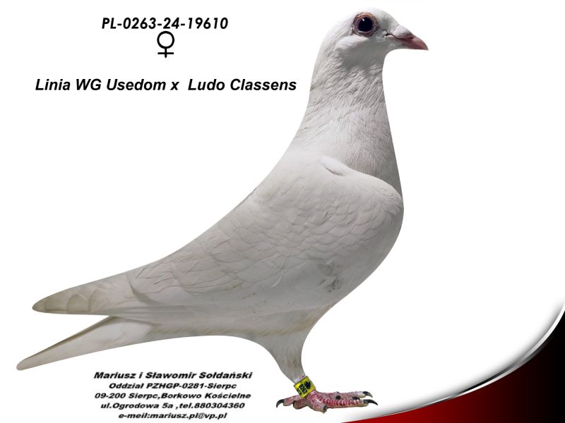 Oryginalny gołąb z hodowli Mariusza i Sławomira Sołdańskich samica z Linii Ludo Classen x WG Usedom super Linia na Wspólne Gołębniki. Nasze wyniki w Mistrzostwie Polski 2018: 6 Miejsce w Intermistrzostwie Międzynarodowym - coeff. 151,73; 23 Miejsce GMP - 1874,73; 29 Miejsce Kat.B - coeff. 86,45. 1 Miejsce Gołąb Średni dystans-Konkurs Redakcji "Hodowca", 1 Miejsce Kat."B"-Konkurs Redakcji "Dobry Lot", 3 Miejsce Kat."D"-Konkurs Redakcji "Dobry Lot", 2 Miejsce "Mistrzostwo Asów Allround"-Konkurs Redakcji "Dobry Lot", 1 Miejsce Kat."B"-Konkurs Redakcji "Poradnik Hodowcy". 2019-Oddział Sierpc: Typowane Mistrz, Open I-vce Mistrz, Open 50 II-V-ce Mistrz, 1 i 3 Lotnik Roczny, Kat. A II V-ce Mistrz, Kat. B II V-ce Mistrz, Kat. D II V-ce Mistrz, Kat. GMP I v-Ce Mistrz, Kat. Inter. I V-ce Mistrz, Super. I V-ce Mistrz. Okręg Płock: II V-ce Mistrz Supermistrzostwo, I V-ce Mistrz GMP, II Lotnik. kat. B. 10 Gołębi w Reprezentacji Okręgu na Wystawę Ogółnopolską 2020. 2 AS POLSKI SPORT „B”-14,62 coef. 2020-Oddział Sierpc: Typowane Mistrz, Open I-vce Mistrz, Open 50 I-V-ce Mistrz, 1 Lotniczka Roczna, Kat. C Mistrz, Kat. M II V-ce Mistrz, Kat. D II V-ce Mistrz, Kat. GMP Mistrz, Kat. Inter. II V-ce Mistrz, Mistrz. Okręg Płock: Kat. GMP Mistrz , Kat.Roczne Mistrz, Kat. C-I Vce Mistrz , Kat. M - I Vce Mistrz Mistrz.Regionu I Łódż- V-ce Mistrz „Roczne”