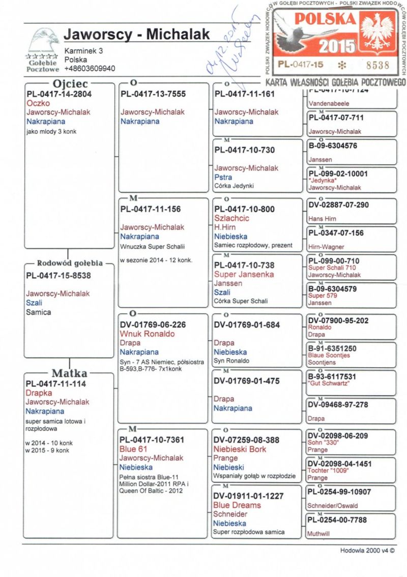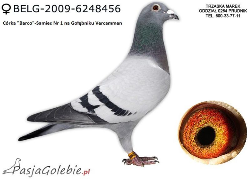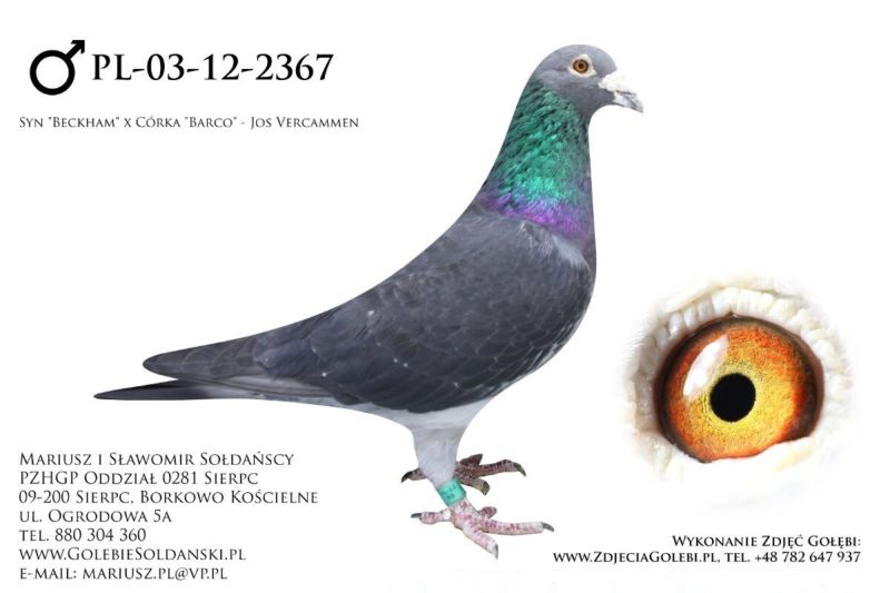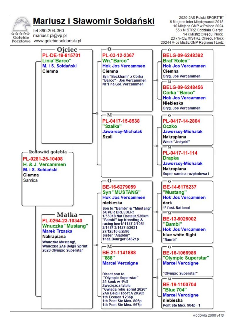 Oryginalna samiczka z hodowli M. i S. Sołdańscy pochodzi po go gołębiach Jos & Hok Vercammen z Linii "Barco" i "Mustang" . Gołąbek pięknej budowy o znakomitych walorach rozpłodowych. Więcej informacji o gołębiu pod nr tel. i poniższych materiałach. Nasze wyniki w Mistrzostwie Polski 2018: 6 Miejsce w Intermistrzostwie Międzynarodowym - coeff. 151,73; 23 Miejsce GMP - 1874,73; 29 Miejsce Kat.B - coeff. 86,45. 1 Miejsce Gołąb Średni dystans-Konkurs Redakcji "Hodowca", 1 Miejsce Kat."B"-Konkurs Redakcji "Dobry Lot", 3 Miejsce Kat."D"-Konkurs Redakcji "Dobry Lot", 2 Miejsce "Mistrzostwo Asów Allround"-Konkurs Redakcji "Dobry Lot", 1 Miejsce Kat."B"-Konkurs Redakcji "Poradnik Hodowcy". 2019-Oddział Sierpc: Typowane Mistrz, Open I-vce Mistrz, Open 50 II-V-ce Mistrz, 1 i 3 Lotnik Roczny, Kat. A II V-ce Mistrz, Kat. B II V-ce Mistrz, Kat. D II V-ce Mistrz, Kat. GMP I v-Ce Mistrz, Kat. Inter. I V-ce Mistrz, Super. I V-ce Mistrz. Okręg Płock: II V-ce Mistrz Supermistrzostwo, I V-ce Mistrz GMP, II Lotnik. kat. B. 10 Gołębi w Reprezentacji Okręgu na Wystawę Ogółnopolską 2020. 2 AS POLSKI SPORT „B”-14,62 coef. 2020-Oddział Sierpc: Typowane Mistrz, Open I-vce Mistrz, Open 50 I-V-ce Mistrz, 1 Lotniczka Roczna, Kat. C Mistrz, Kat. M II V-ce Mistrz, Kat. D II V-ce Mistrz, Kat. GMP Mistrz, Kat. Inter. II V-ce Mistrz, Mistrz. Okręg Płock: Kat. GMP Mistrz , Kat.Roczne Mistrz, Kat. C-I Vce Mistrz , Kat. M - I Vce Mistrz Mistrz.Regionu I Łódż- V-ce Mistrz „Roczne” 2021- Supermistrz Oddziału Sierpc Mistrz Okręgu Płock Kat." Maraton" Supermistrz Okręgu Płock,2022 6 gołębi w reprezentacji Okręgu Płock na Wystawę Ogólnopolską.2022- II Supermistrz Oddziału Sierpc, 8 x V-ce Mistrz Oddziału. 1 AS WG Kaszuby 2022, 2 drużyna WG Kosakowo 2022, 4 AS WG Kosakowo. 6 AS WG Roztocze 2022. 6 gołębi w reprezentacji Okręgu Płock na Wystawę Ogólnopolską 2023. 2022-1 Samica w Polsce PL-0281-17-3077 w Kat. "Supermaraton"- Konkurs Redakcji"Hodowca"