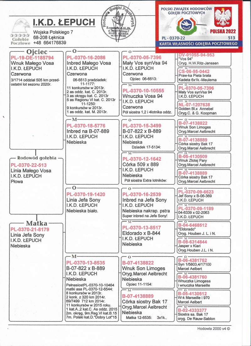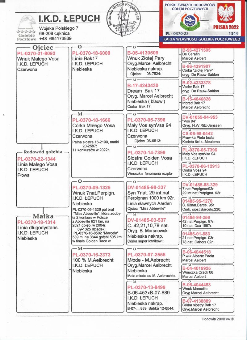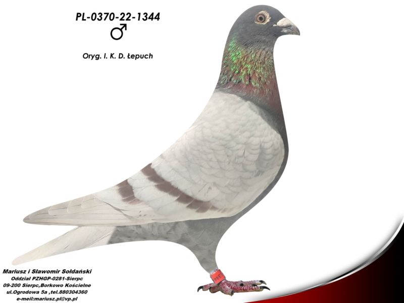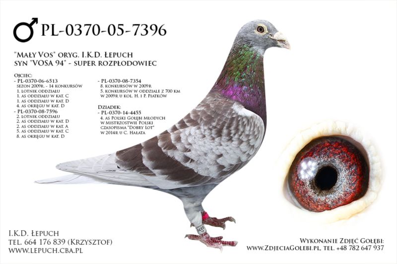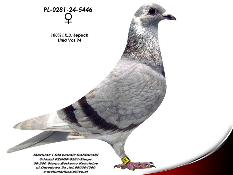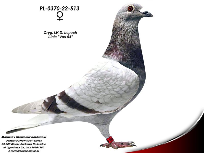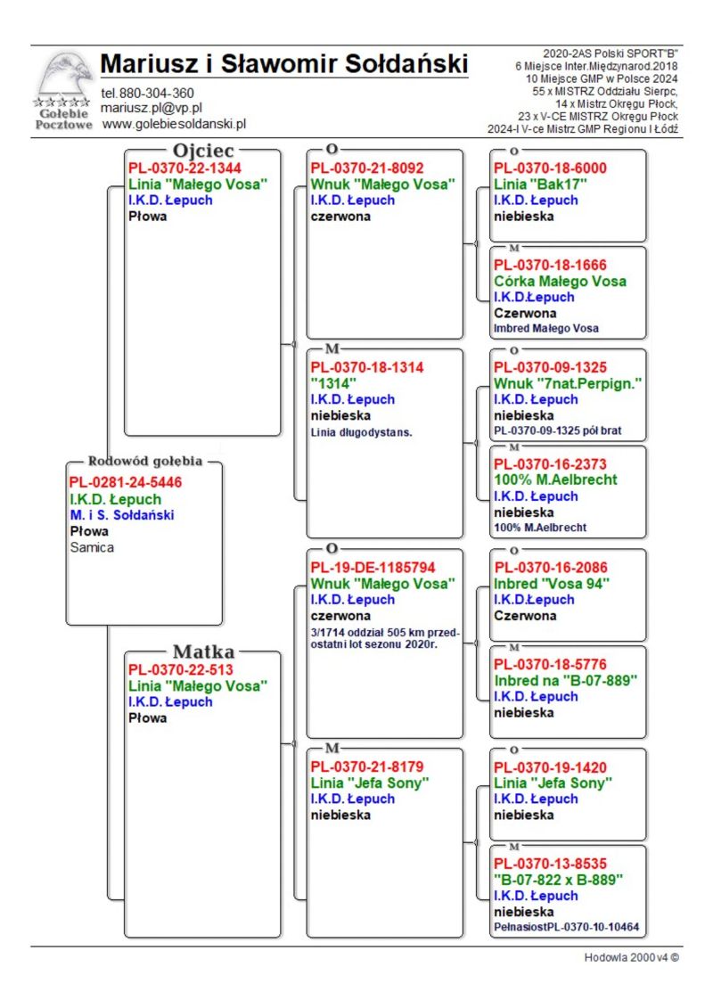 Oryginalna samica z hodowli M. i S. Sołdańscy super Lina Vos 94 I.K.D. Łepuch. Więcej informacji o gołębiu pod nr tel. i poniższych materiałach. Nasze wyniki w Mistrzostwie Polski 2018: 6 Miejsce w Intermistrzostwie Międzynarodowym - coeff. 151,73; 23 Miejsce GMP - 1874,73; 29 Miejsce Kat.B - coeff. 86,45. 1 Miejsce Gołąb Średni dystans-Konkurs Redakcji "Hodowca", 1 Miejsce Kat."B"-Konkurs Redakcji "Dobry Lot", 3 Miejsce Kat."D"-Konkurs Redakcji "Dobry Lot", 2 Miejsce "Mistrzostwo Asów Allround"-Konkurs Redakcji "Dobry Lot", 1 Miejsce Kat."B"-Konkurs Redakcji "Poradnik Hodowcy". 2019-Oddział Sierpc: Typowane Mistrz, Open I-vce Mistrz, Open 50 II-V-ce Mistrz, 1 i 3 Lotnik Roczny, Kat. A II V-ce Mistrz, Kat. B II V-ce Mistrz, Kat. D II V-ce Mistrz, Kat. GMP I v-Ce Mistrz, Kat. Inter. I V-ce Mistrz, Super. I V-ce Mistrz. Okręg Płock: II V-ce Mistrz Supermistrzostwo, I V-ce Mistrz GMP, II Lotnik. kat. B. 10 Gołębi w Reprezentacji Okręgu na Wystawę Ogółnopolską 2020. 2 AS POLSKI SPORT „B”-14,62 coef. 2020-Oddział Sierpc: Typowane Mistrz, Open I-vce Mistrz, Open 50 I-V-ce Mistrz, 1 Lotniczka Roczna, Kat. C Mistrz, Kat. M II V-ce Mistrz, Kat. D II V-ce Mistrz, Kat. GMP Mistrz, Kat. Inter. II V-ce Mistrz, Mistrz. Okręg Płock: Kat. GMP Mistrz , Kat.Roczne Mistrz, Kat. C-I Vce Mistrz , Kat. M - I Vce Mistrz Mistrz.Regionu I Łódż- V-ce Mistrz „Roczne” 2021- Supermistrz Oddziału Sierpc Mistrz Okręgu Płock Kat." Maraton" Supermistrz Okręgu Płock,2022 6 gołębi w reprezentacji Okręgu Płock na Wystawę Ogólnopolską.2022- II Supermistrz Oddziału Sierpc, 8 x V-ce Mistrz Oddziału. 1 AS WG Kaszuby 2022, 2 drużyna WG Kosakowo 2022, 4 AS WG Kosakowo. 6 AS WG Roztocze 2022. 6 gołębi w reprezentacji Okręgu Płock na Wystawę Ogólnopolską 2023. 2022-1 Samica w Polsce PL-0281-17-3077 w Kat. "Supermaraton"- Konkurs Redakcji"