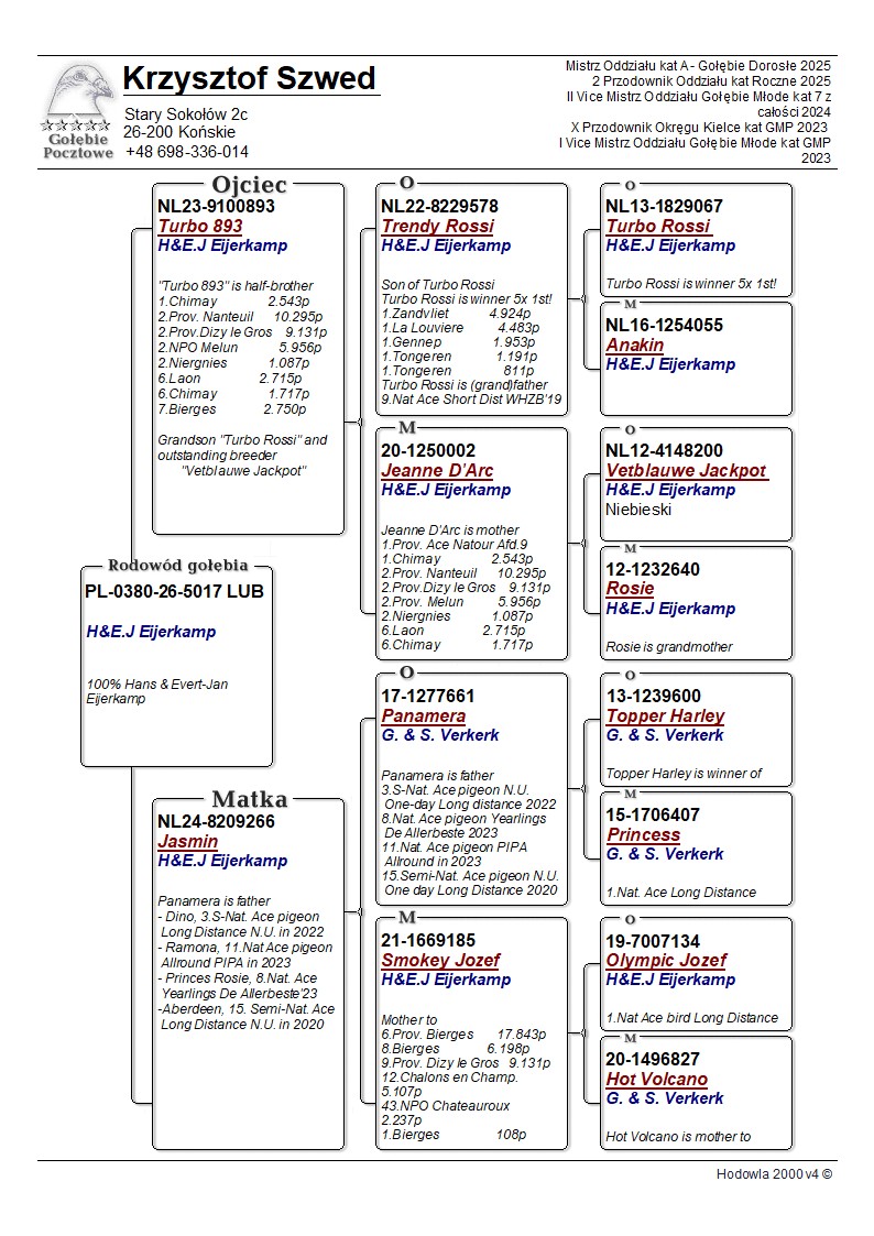 Gołąb zaszczepiony RP. Poniżej rodowody rodziców.