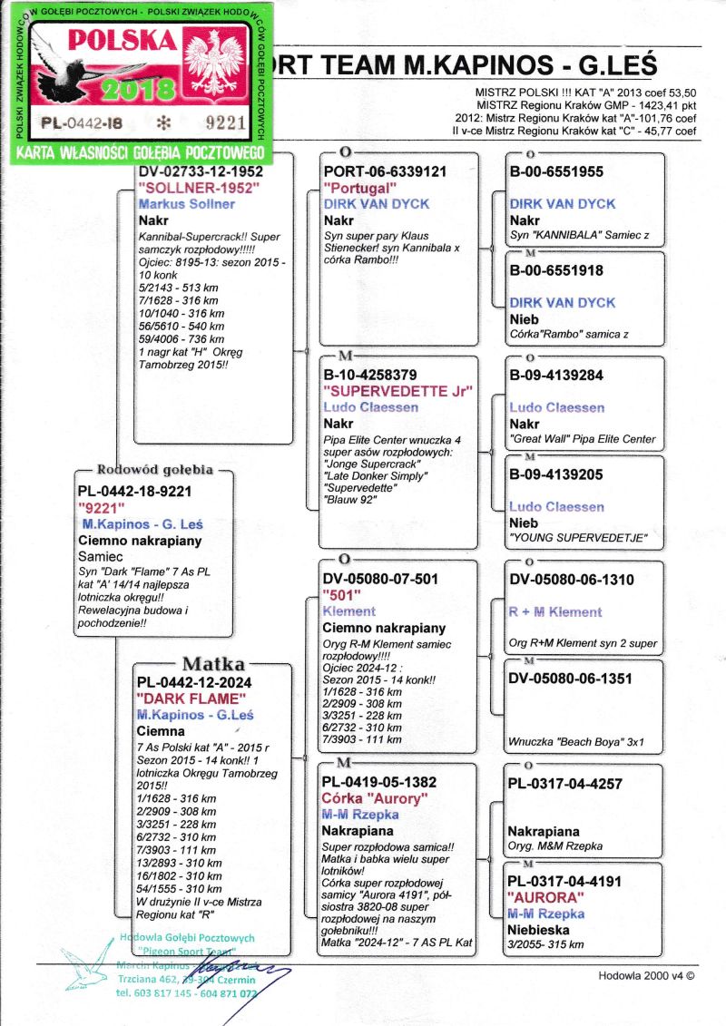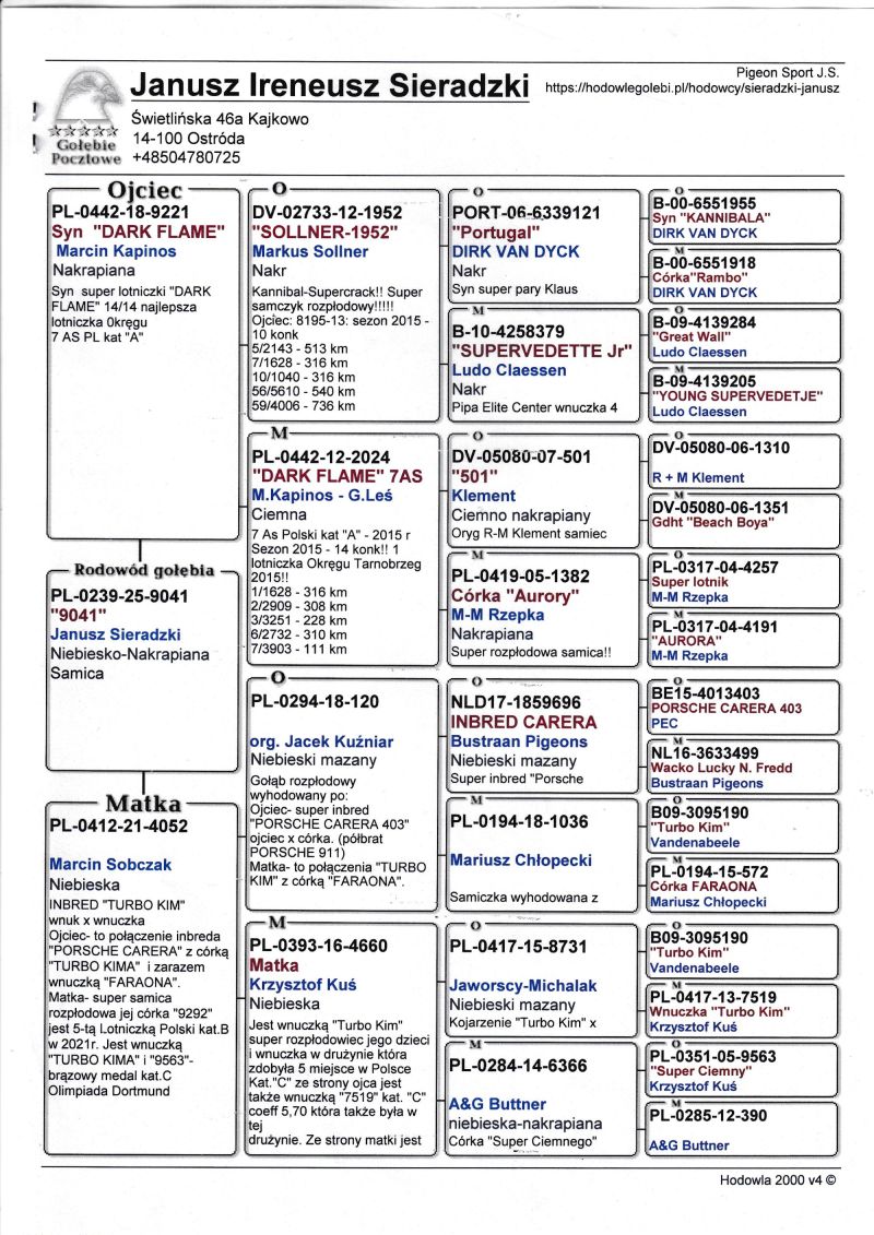 Szczegóły pochodzenia w rodowodzie. Możliwość wysyłki gołębi. Więcej informacji pod nr tel. 504780725