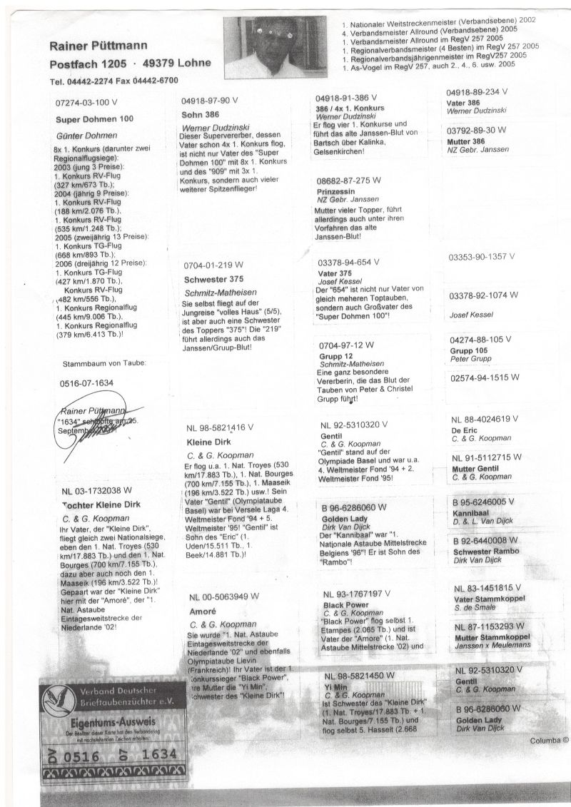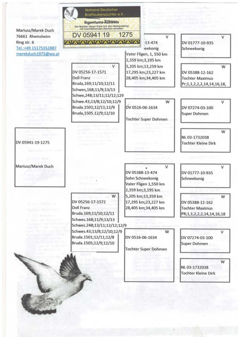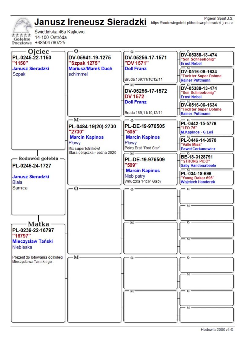 Szczegóły pochodzenia w rodowodzie. Możliwość wysyłki gołębi. Więcej informacji pod nr tel. 504780725