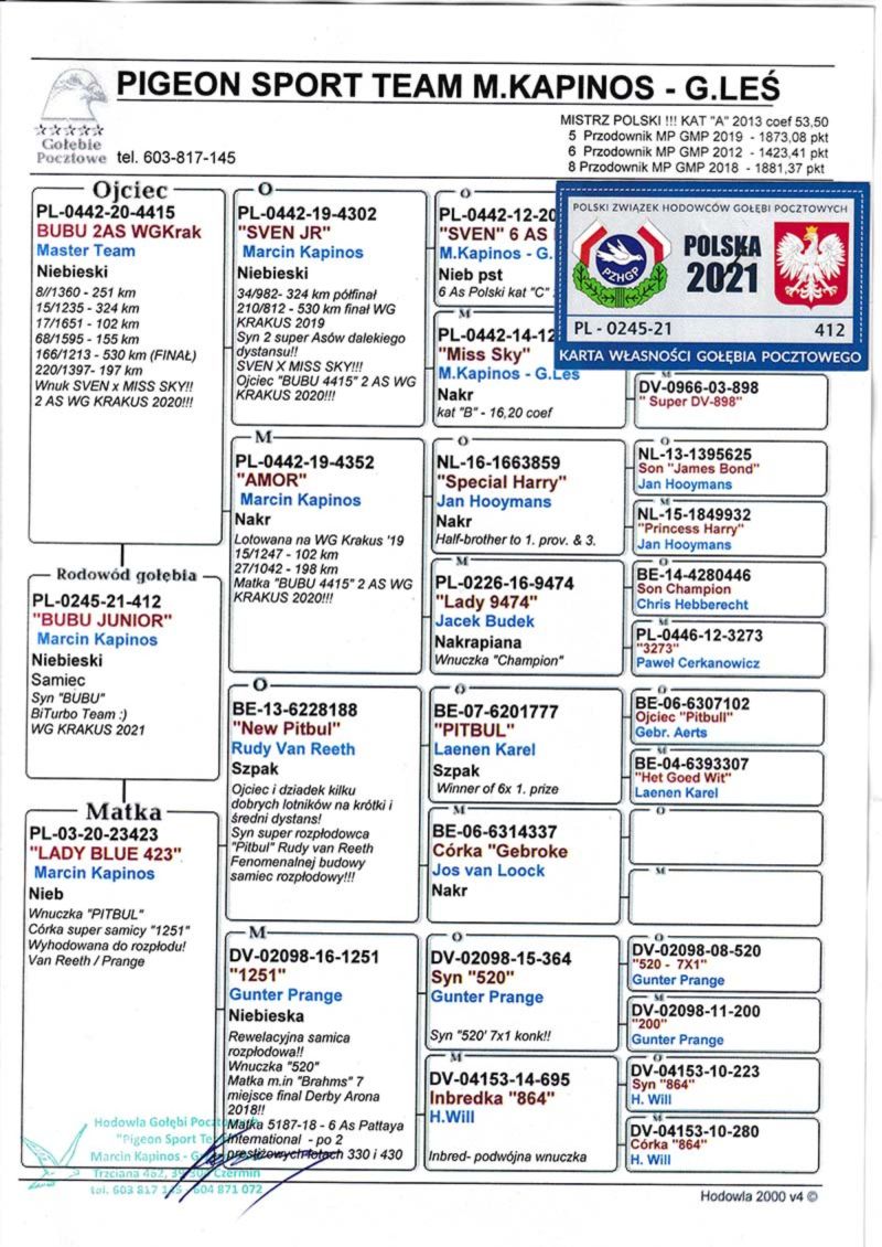 Płeć: samiec Hodowca - rasa: Pigeon Sport J.S. Zakończenie: 22.04.2026 godz. 21:25