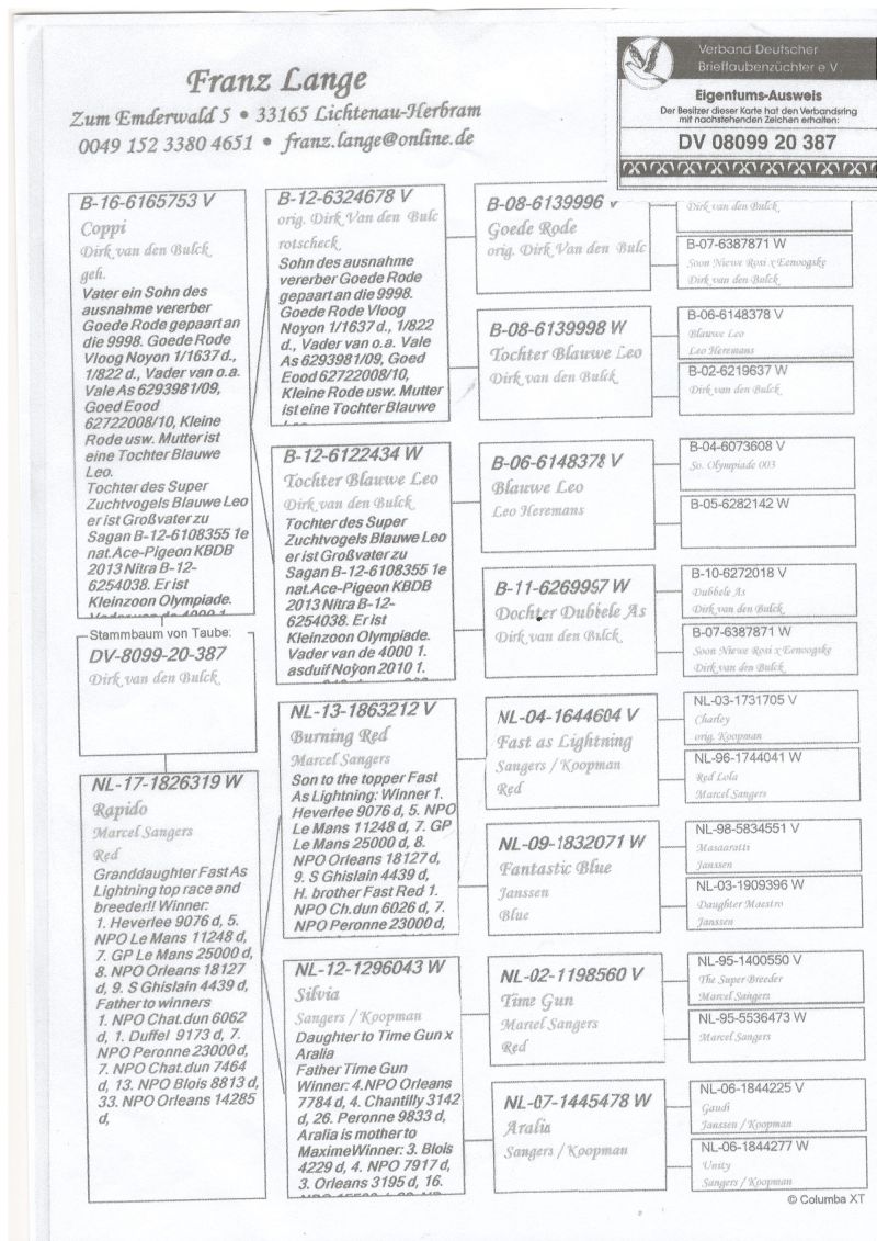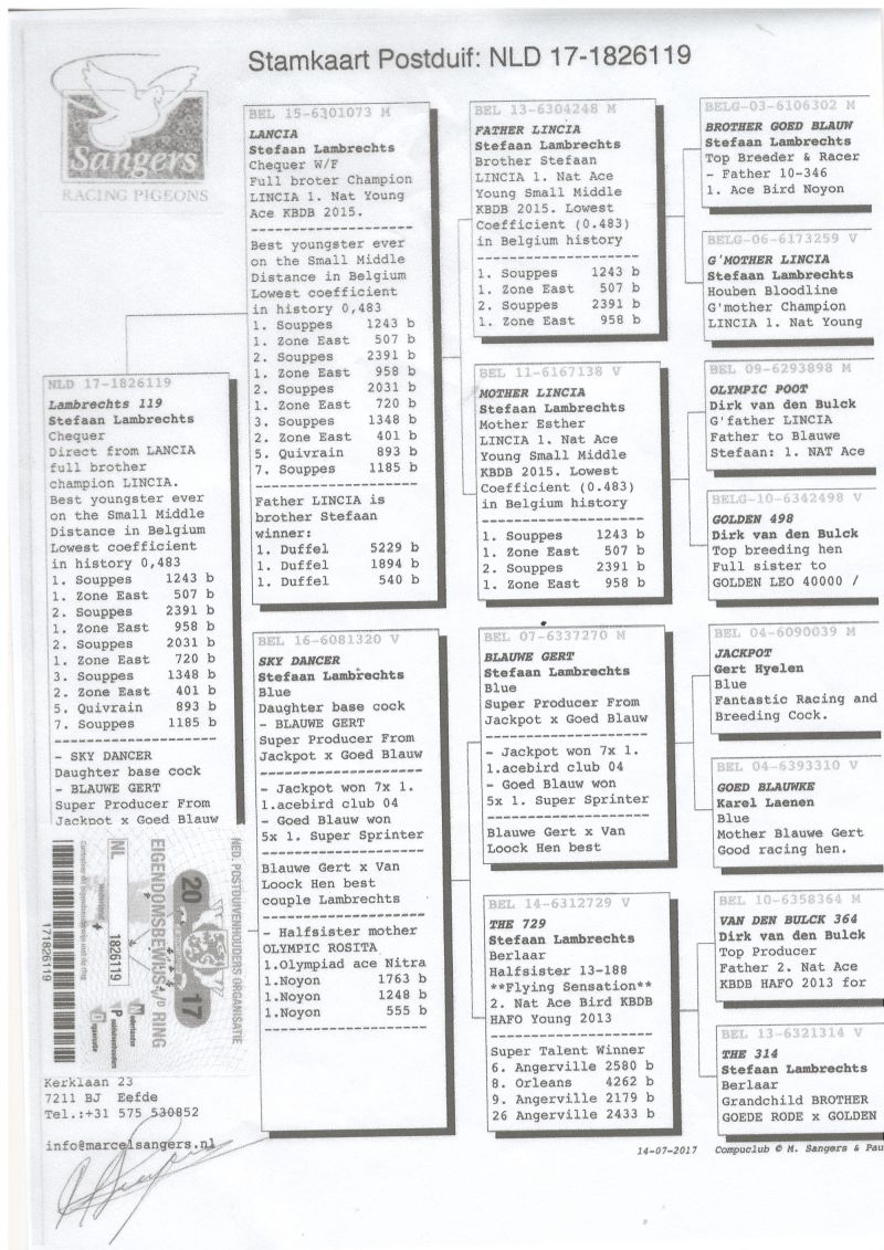 Szczegóły pochodzenia w rodowodzie. Możliwość wysyłki gołębi. Więcej informacji pod nr tel. 504780725
