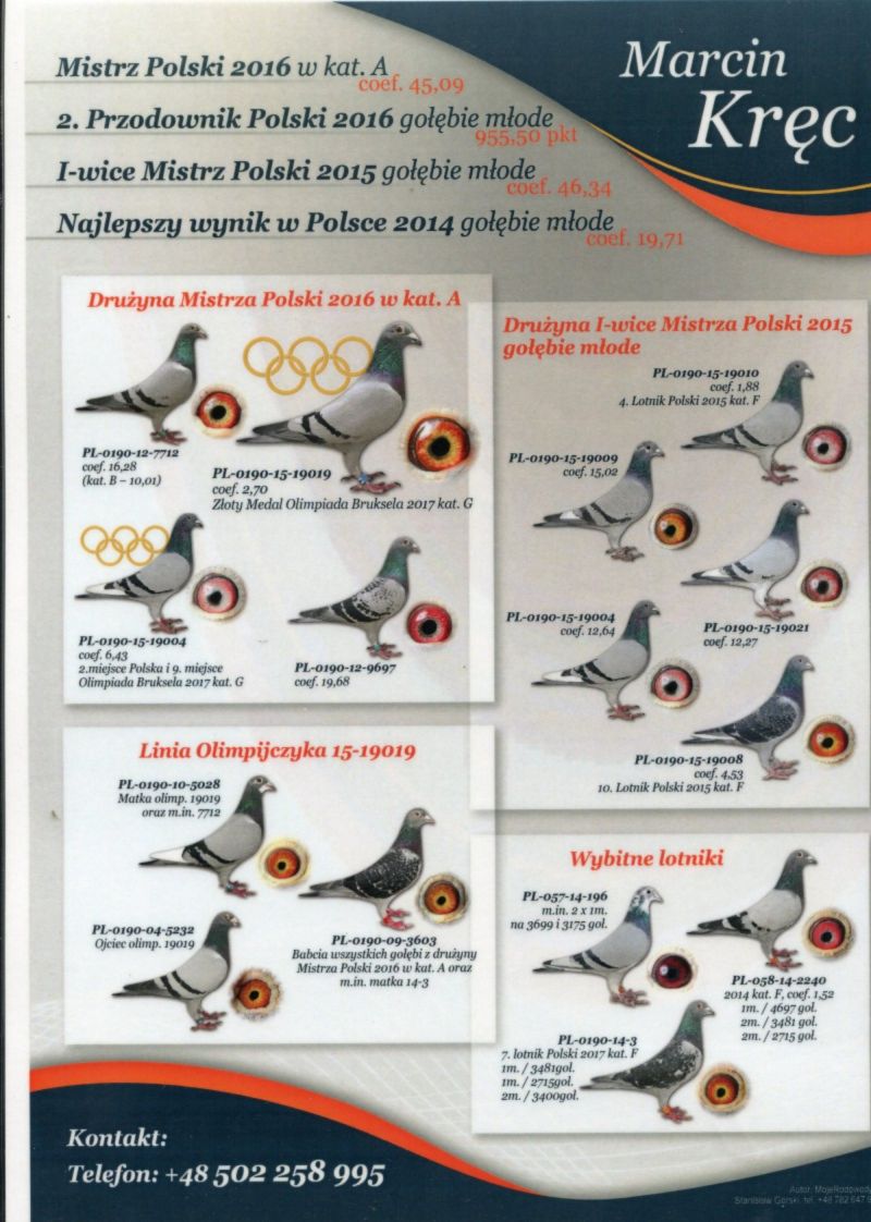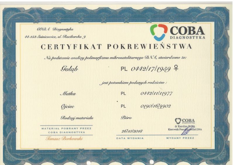 Szczegóły pochodzenia w rodowodzie. Możliwość wysyłki gołębi. Więcej informacji pod nr tel. 504780725