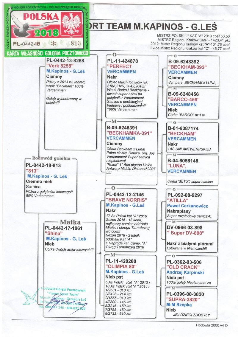 PL-0442-18-813 oryg. M.Kapinos - G.Leś - Vercammen x córka "BRAVE NORRIS" i "OLIMPIA 80"