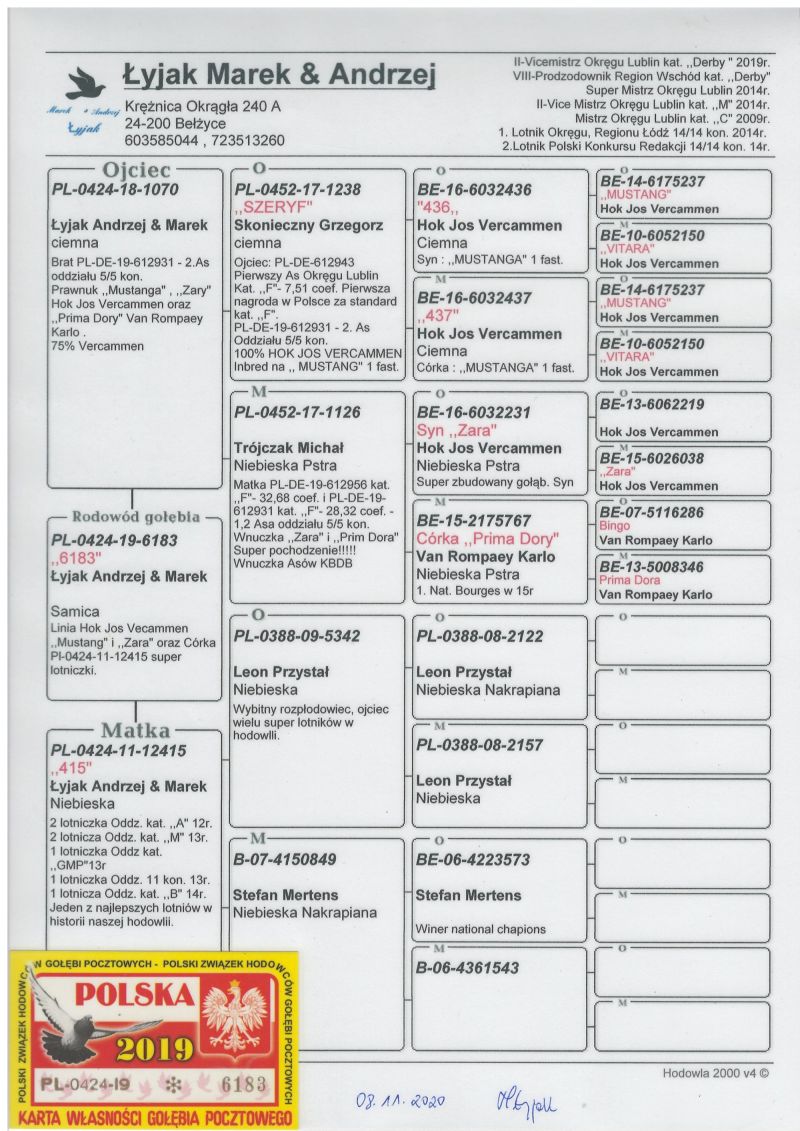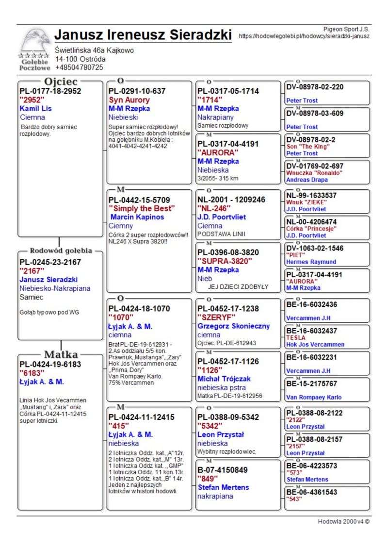 Szczegóły pochodzenia w rodowodzie. Możliwość wysyłki gołębi. Więcej informacji pod nr tel. 504780725