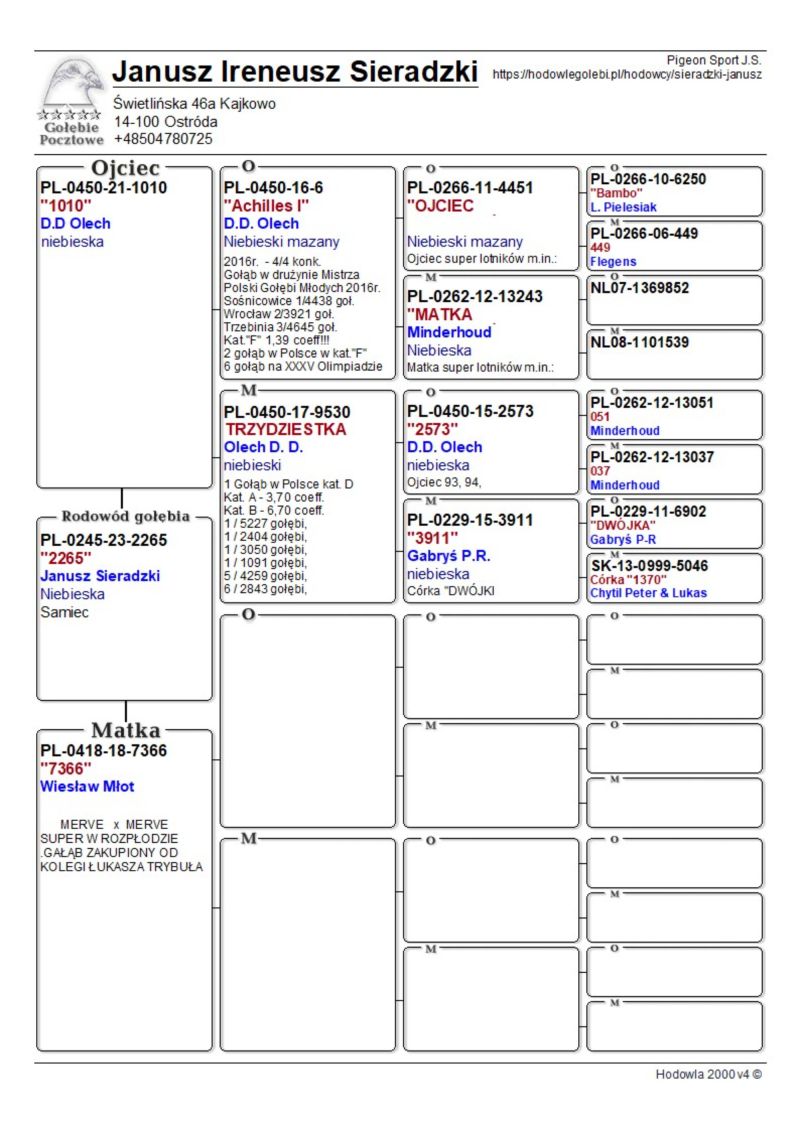 Szczegóły pochodzenia w rodowodzie. Możliwość wysyłki gołębi. Więcej informacji pod nr tel. 504780725