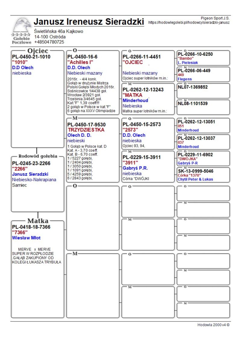 Szczegóły pochodzenia w rodowodzie. Możliwość wysyłki gołębi. Więcej informacji pod nr tel. 504780725