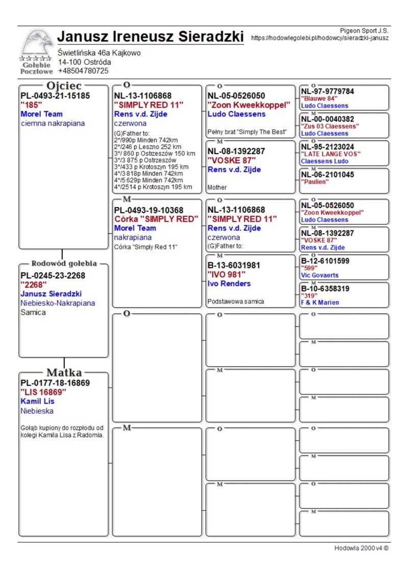 Szczegóły pochodzenia w rodowodzie. Możliwość wysyłki gołębi. Więcej informacji pod nr tel. 504780725