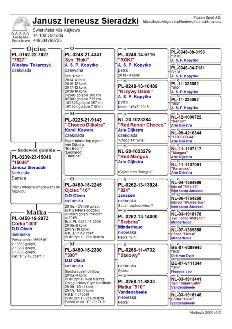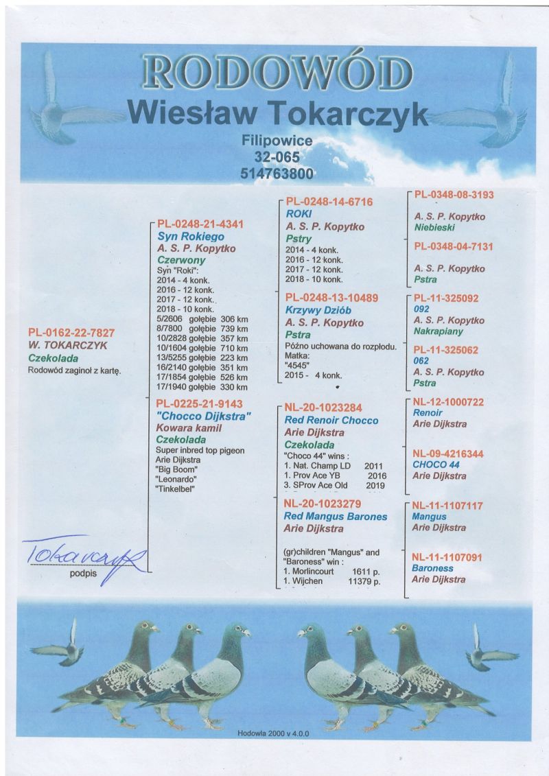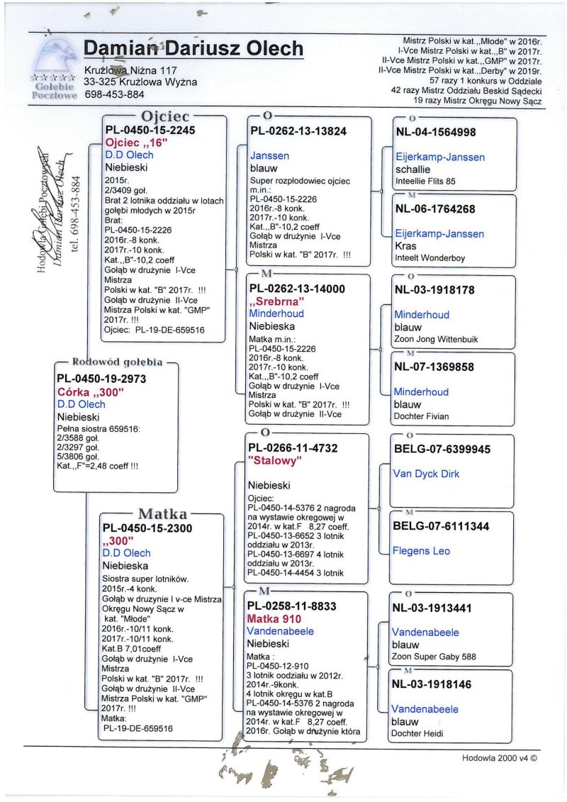 Szczegóły pochodzenia w rodowodzie. Możliwość wysyłki gołębi. Więcej informacji pod nr tel. 504780725