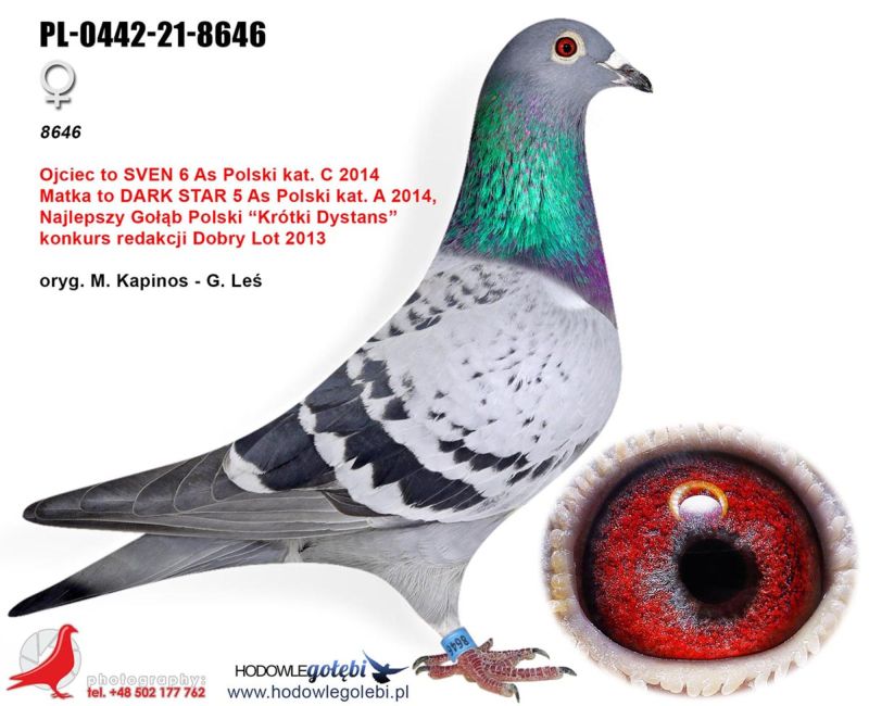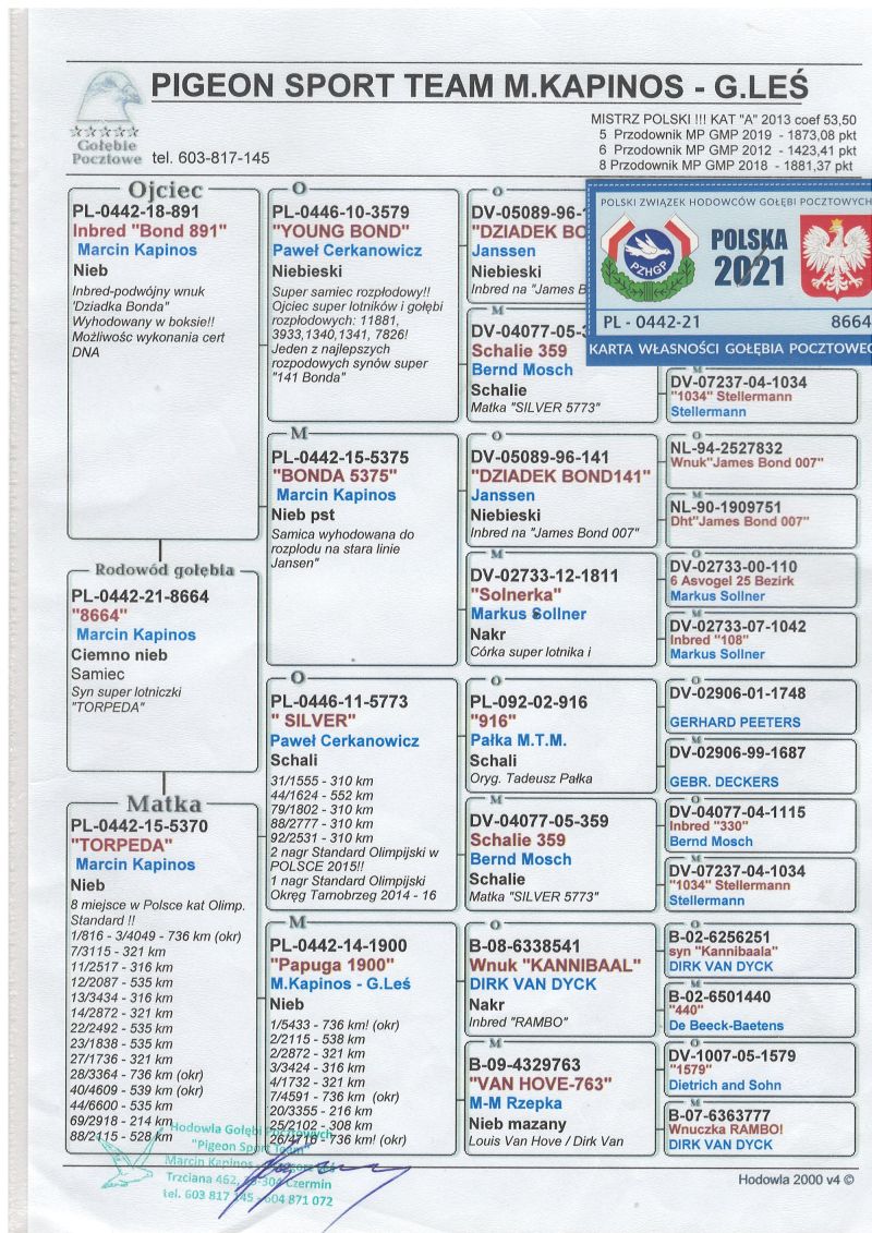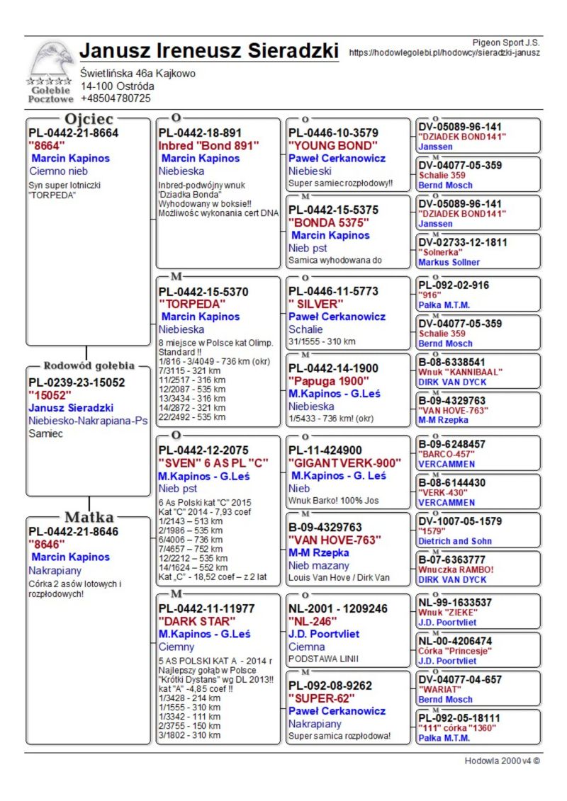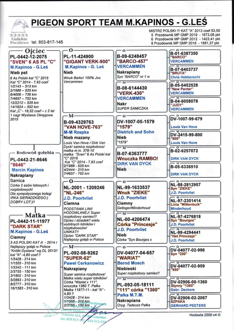 Szczegóły pochodzenia w rodowodzie. Możliwość wysyłki gołębi. Więcej informacji pod nr tel. 504780725