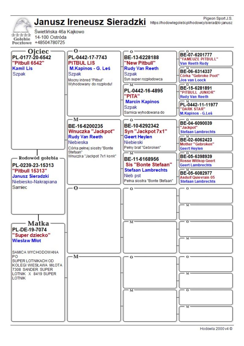 Szczegóły pochodzenia w rodowodzie. Możliwość wysyłki gołębi. Więcej informacji pod nr tel. 504780725
