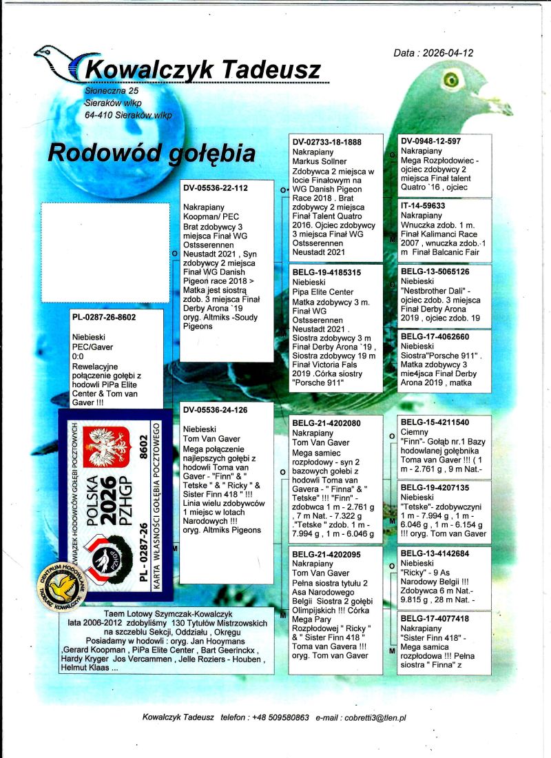 PL-0287-26-8602 Mega połaczenie gołebi z hodowli Tom van Gaver / PiPa Elite Center