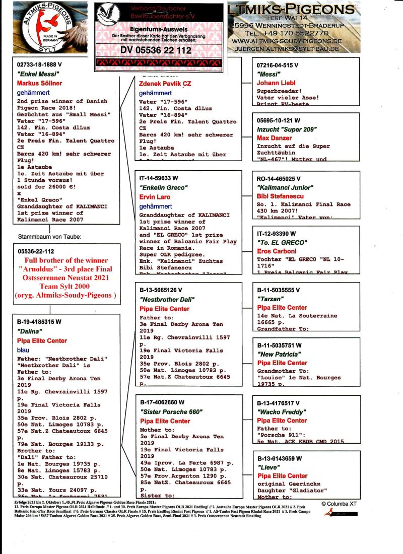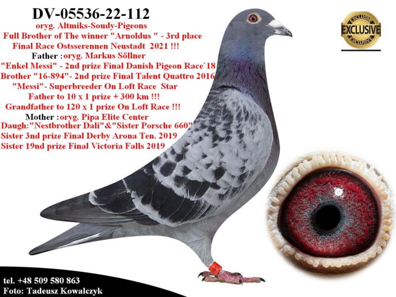 AUKCJA PROMOCYJNA (Cena obowiązuje wyłącznie na tej aukcji) Profesjonalna hodowla z wieloletnim doświadczeniem, posiadająca w swoim stadzie materiał najwyższej światowej klasy, wywodzący się od takich hodowców jak: Jan Hooymans, Gerard Koopman, Mike Ganus, Tjeerd & Jouke Elzinga, Gino Clicque, Jos Vercammen, Jelle Roziers, Bart Geerinckx, Batenburg – v/d Merwe, Altmiks – Pigeons, Jo & Florian Hendriks, Kornelis Winner Loft – linia „Romario”, W & F Ebben, Bert Braspenning, Dirk van den Bulck, Peter v/d Merwe, Jan van de Pasch, Van Elsacker-Jepsen, Roger Desmet – Matthijs, Arie Dijkstra, Leo Heremans, Pieter Veenstra, Gaby Vandenabeele, Karl-Heinz Wichert, Hardy Kruger, Helmut & Alfons Klaas, Gebr. Janssen. Najwyższej klasy materiał hodowlany – najlepsze linie danych Hodowców. Wszystkie wylicytowane gołębie będą dostarczane firmą kurierską.