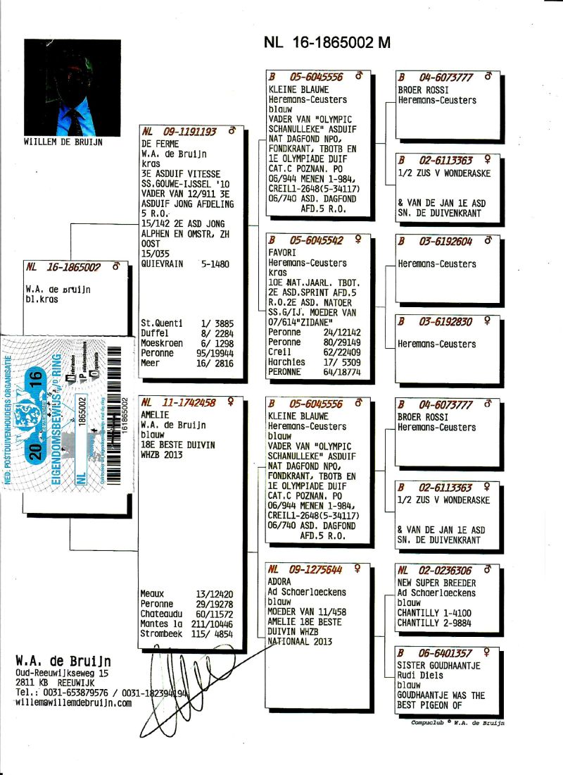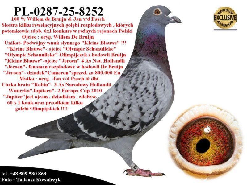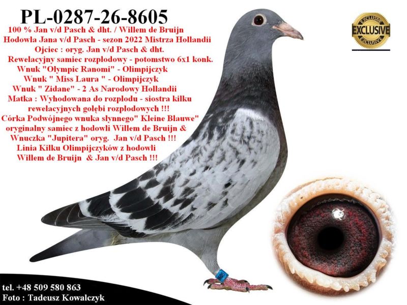 AUKCJA PROMOCYJNA (Cena obowiązuje wyłącznie na tej aukcji) Profesjonalna hodowla z wieloletnim doświadczeniem, posiadająca w swoim stadzie materiał najwyższej światowej klasy, wywodzący się od takich hodowców jak: Jan Hooymans, Gerard Koopman, Mike Ganus, Tjeerd & Jouke Elzinga, Gino Clicque, Jos Vercammen, Jelle Roziers, Bart Geerinckx, Batenburg – v/d Merwe, Altmiks – Pigeons, Jo & Florian Hendriks, Kornelis Winner Loft – linia „Romario”, W & F Ebben, Bert Braspenning, Dirk van den Bulck, Peter v/d Merwe, Jan van de Pasch, Van Elsacker-Jepsen, Roger Desmet – Matthijs, Arie Dijkstra, Leo Heremans, Pieter Veenstra, Gaby Vandenabeele, Karl-Heinz Wichert, Hardy Kruger, Helmut & Alfons Klaas, Gebr. Janssen. Najwyższej klasy materiał hodowlany – najlepsze linie danych Hodowców. Wszystkie wylicytowane gołębie będą dostarczane firmą kurierską.