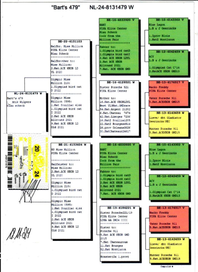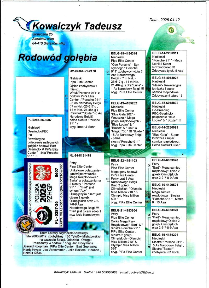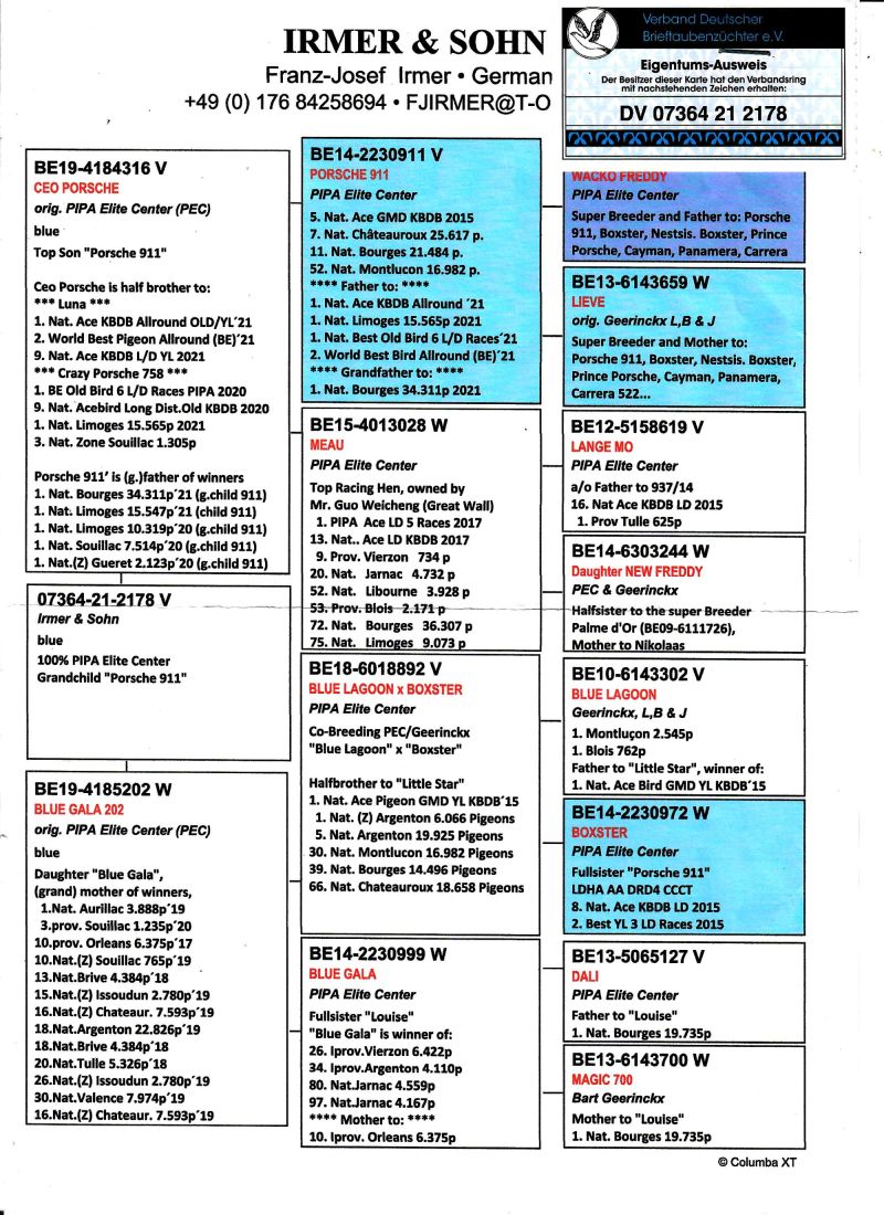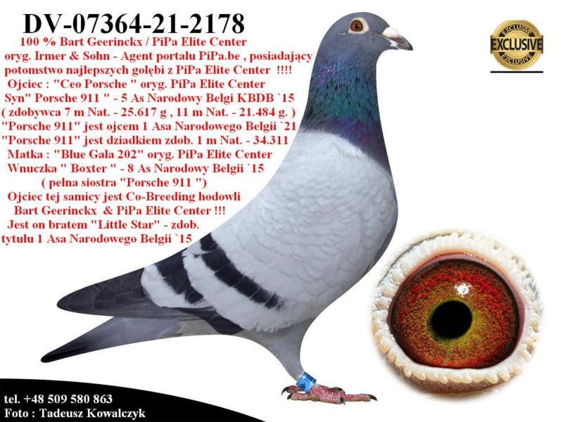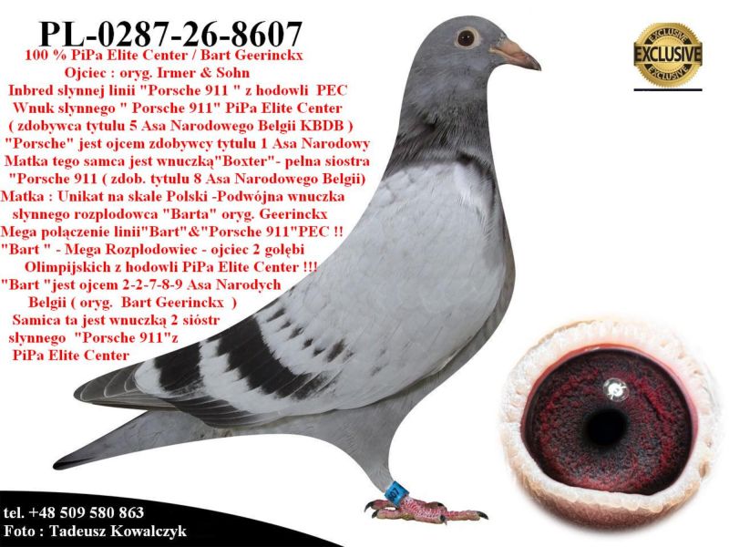 AUKCJA PROMOCYJNA (Cena obowiązuje wyłącznie na tej aukcji) Profesjonalna hodowla z wieloletnim doświadczeniem, posiadająca w swoim stadzie materiał najwyższej światowej klasy, wywodzący się od takich hodowców jak: Jan Hooymans, Gerard Koopman, Mike Ganus, Tjeerd & Jouke Elzinga, Gino Clicque, Jos Vercammen, Jelle Roziers, Bart Geerinckx, Batenburg – v/d Merwe, Altmiks – Pigeons, Jo & Florian Hendriks, Kornelis Winner Loft – linia „Romario”, W & F Ebben, Bert Braspenning, Dirk van den Bulck, Peter v/d Merwe, Jan van de Pasch, Van Elsacker-Jepsen, Roger Desmet – Matthijs, Arie Dijkstra, Leo Heremans, Pieter Veenstra, Gaby Vandenabeele, Karl-Heinz Wichert, Hardy Kruger, Helmut & Alfons Klaas, Gebr. Janssen. Najwyższej klasy materiał hodowlany – najlepsze linie danych Hodowców. Wszystkie wylicytowane gołębie będą dostarczane firmą kurierską.