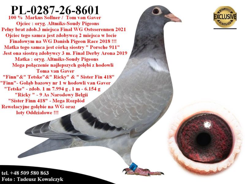 AUKCJA PROMOCYJNA (Cena obowiązuje wyłącznie na tej aukcji) Profesjonalna hodowla z wieloletnim doświadczeniem, posiadająca w swoim stadzie materiał najwyższej światowej klasy, wywodzący się od takich hodowców jak: Jan Hooymans, Gerard Koopman, Mike Ganus, Tjeerd & Jouke Elzinga, Gino Clicque, Jos Vercammen, Jelle Roziers, Bart Geerinckx, Batenburg – v/d Merwe, Altmiks – Pigeons, Jo & Florian Hendriks, Kornelis Winner Loft – linia „Romario”, W & F Ebben, Bert Braspenning, Dirk van den Bulck, Peter v/d Merwe, Jan van de Pasch, Van Elsacker-Jepsen, Roger Desmet – Matthijs, Arie Dijkstra, Leo Heremans, Pieter Veenstra, Gaby Vandenabeele, Karl-Heinz Wichert, Hardy Kruger, Helmut & Alfons Klaas, Gebr. Janssen. Najwyższej klasy materiał hodowlany – najlepsze linie danych Hodowców. Wszystkie wylicytowane gołębie będą dostarczane firmą kurierską.
