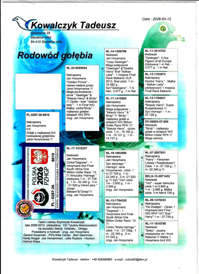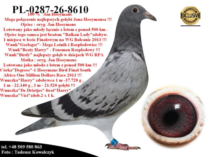 PL-0287-26-8610 Potomek najlepszych gołebi z hodowli Jana Hooymansa