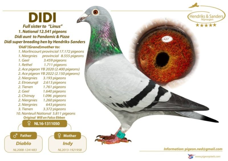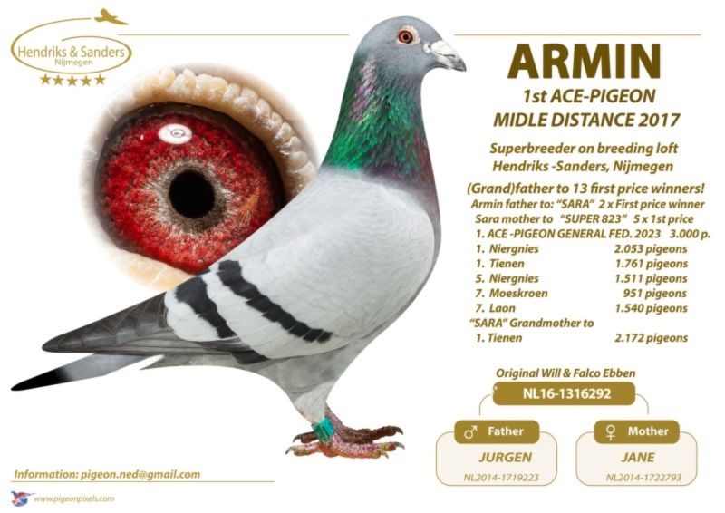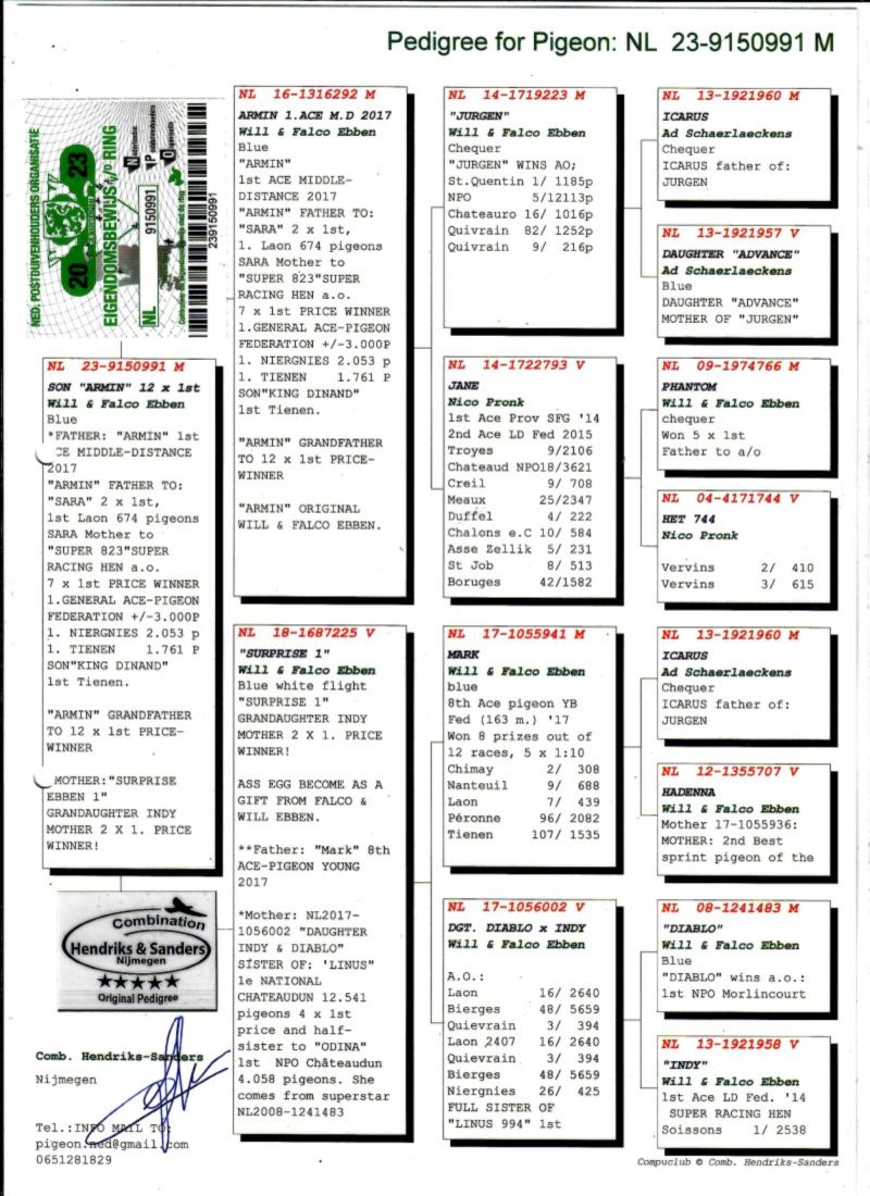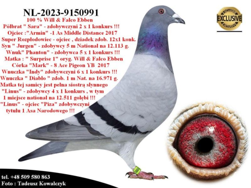AUKCJA PROMOCYJNA (Cena obowiązuje wyłącznie na tej aukcji) Profesjonalna hodowla z wieloletnim doświadczeniem, posiadająca w swoim stadzie materiał najwyższej światowej klasy, wywodzący się od takich hodowców jak: Jan Hooymans, Gerard Koopman, Mike Ganus, Tjeerd & Jouke Elzinga, Gino Clicque, Jos Vercammen, Jelle Roziers, Bart Geerinckx, Batenburg – v/d Merwe, Altmiks – Pigeons, Jo & Florian Hendriks, Kornelis Winner Loft – linia „Romario”, W & F Ebben, Bert Braspenning, Dirk van den Bulck, Peter v/d Merwe, Jan van de Pasch, Van Elsacker-Jepsen, Roger Desmet – Matthijs, Arie Dijkstra, Leo Heremans, Pieter Veenstra, Gaby Vandenabeele, Karl-Heinz Wichert, Hardy Kruger, Helmut & Alfons Klaas, Gebr. Janssen. Najwyższej klasy materiał hodowlany – najlepsze linie danych Hodowców. Wszystkie wylicytowane gołębie będą dostarczane firmą kurierską.