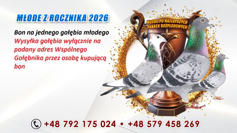 Profesjonalna hodowla z wieloletnim doświadczeniem, posiadająca w swoim stadzie materiał najwyższej światowej klasy. Więcej informacji w załączonych materiałach oraz pod nr tel. 792-175-024 BONY NA GOŁĘBIE MŁODE ROCZNIKA 2026 -UWAGA WYSYŁKA TYLKO NA WSPÓLNY GOŁĘBNIK WYBRANY PRZEZ OSOBĘ KUPUJĄCĄ BON Transport na WG SUPERGOLAB jest darmowy