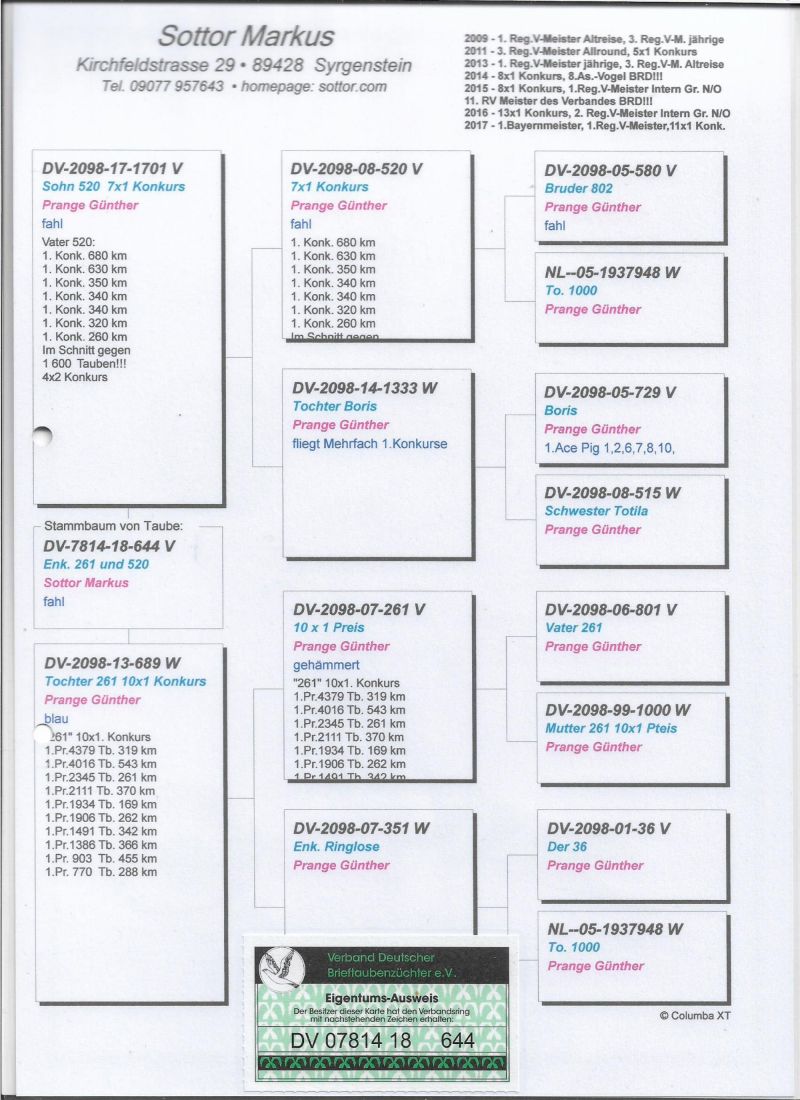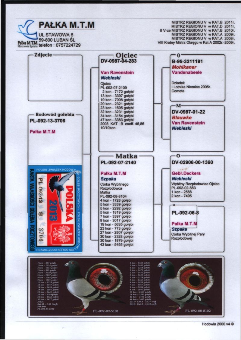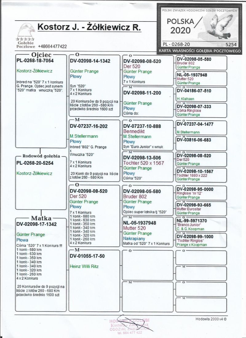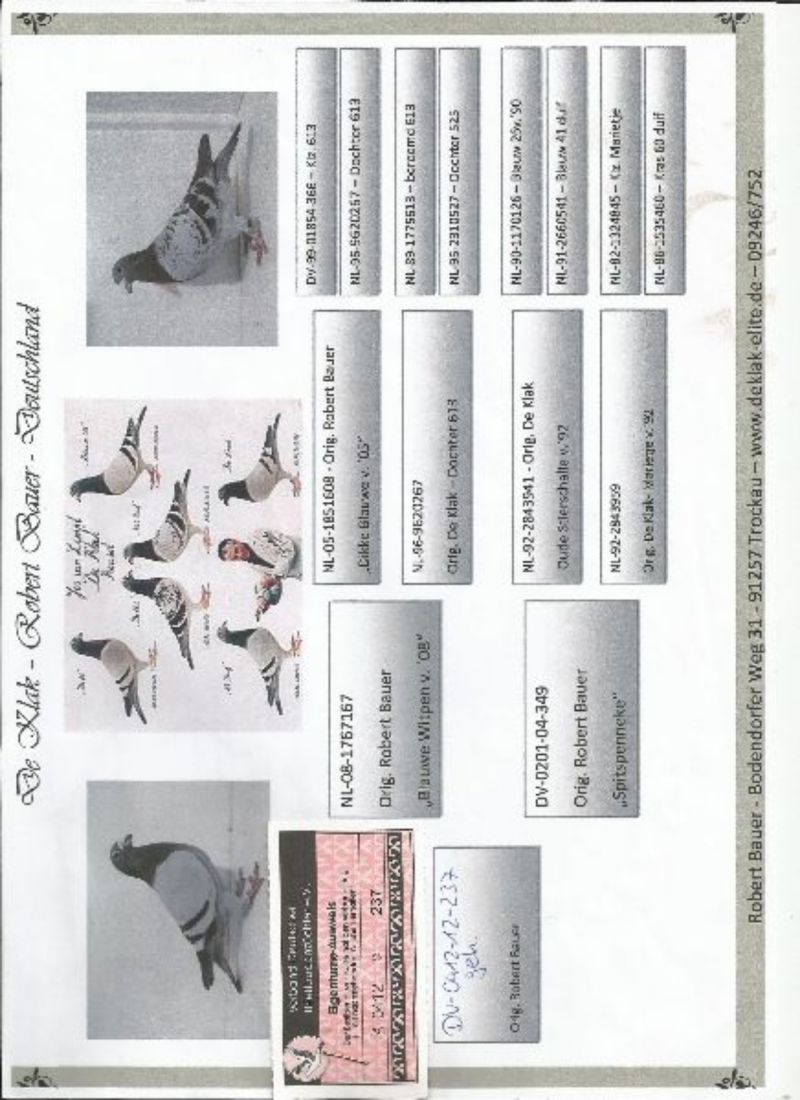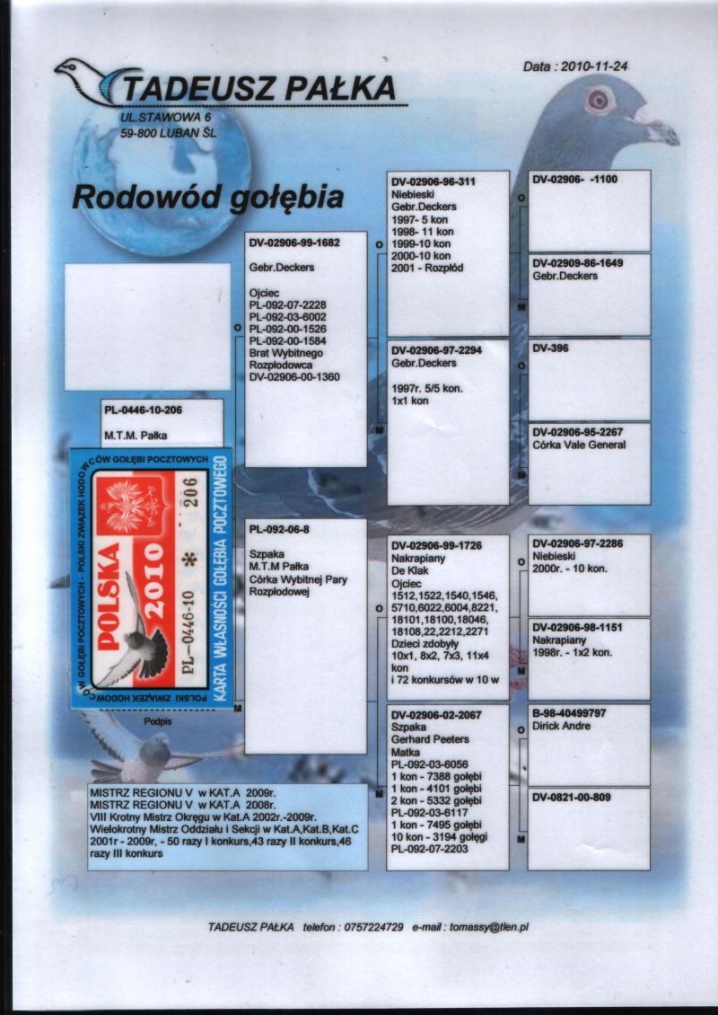 5 młodych do lotów, gołąbki będą wysłane w maju. Gołębie z mojej hodowli bardzo dobrze spisują się u hodowców, zarówno w lotach gołębi młodych jak i starych. Oryginalna samiczka z mojej hodowli lotowana u kolegów Zasadni została gołębiem Olimpijskim. Młode wybiore wg uznania, będą z gołębi m. in. De Klak, Fieneke 5000, Vos, Pałka, Rumiński, Paszek 808, Radwan, Schellens, Prange, linii czołowych lotników Polski...