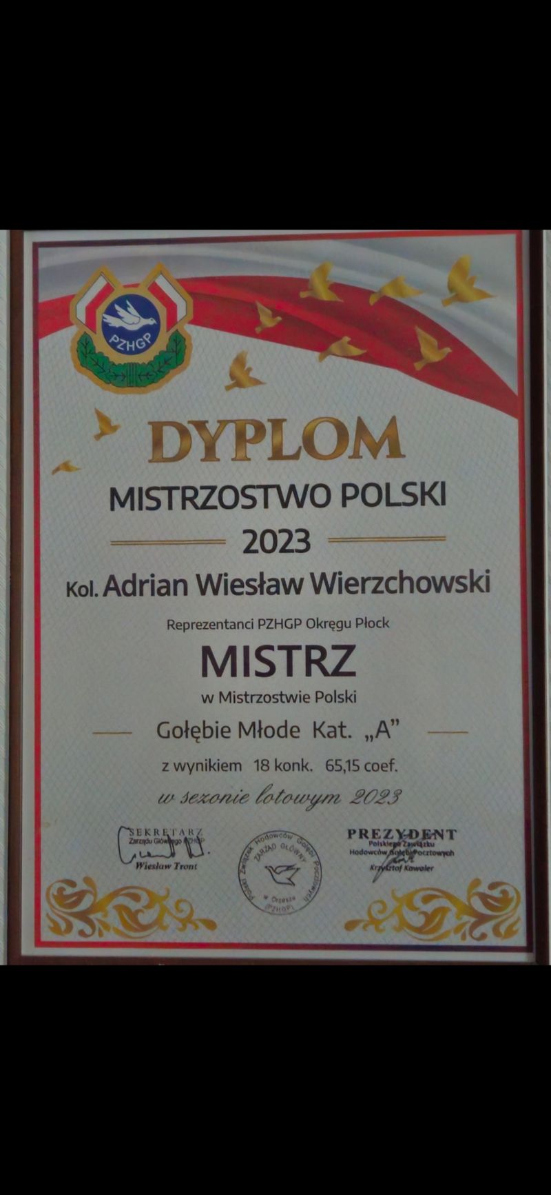 Płeć: młody gołąb Hodowca - rasa: Wierzchowski Adrian Zakończenie: 4.05.2026 godz. 22:10