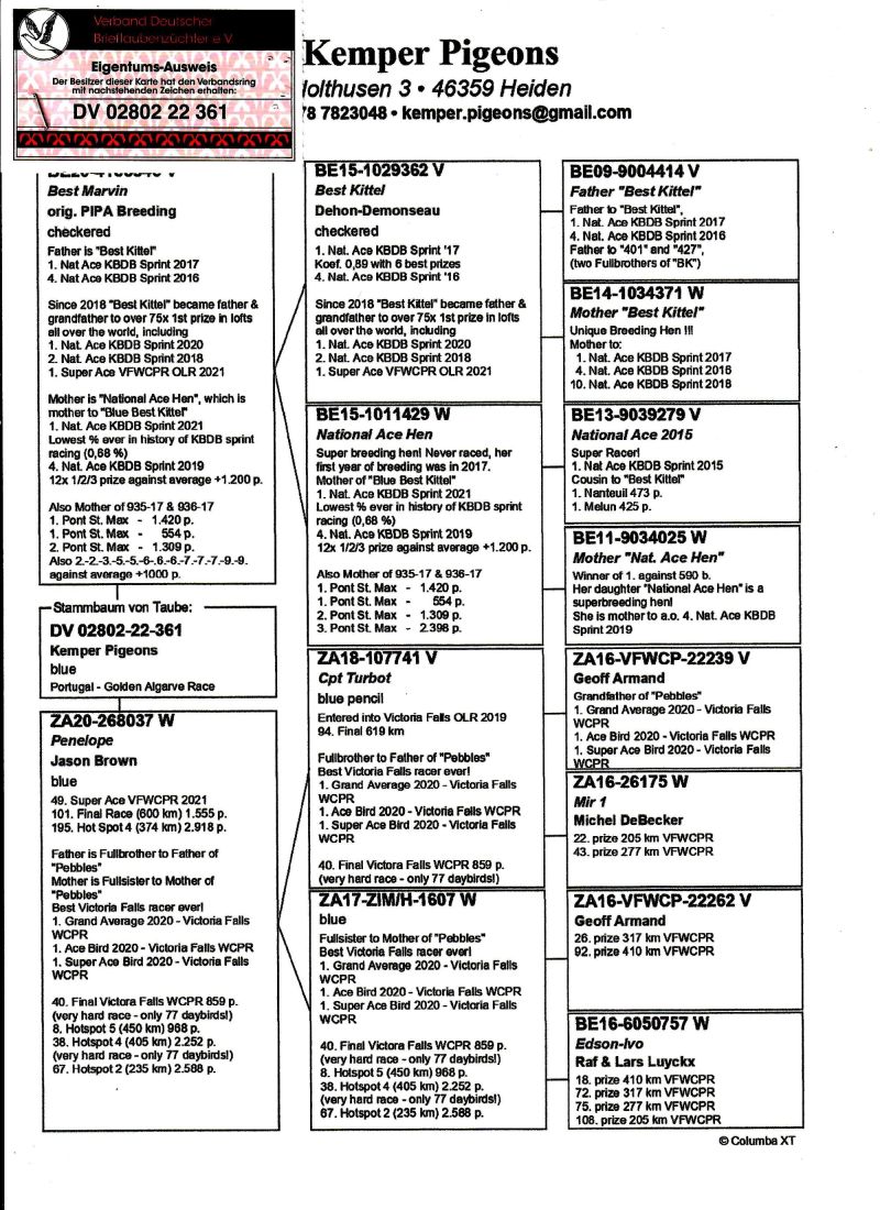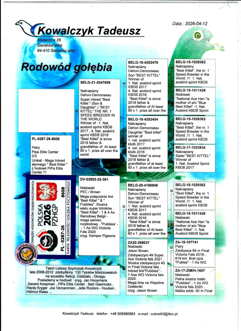 AUKCJA PROMOCYJNA (Cena obowiązuje wyłącznie na tej aukcji) Profesjonalna hodowla z wieloletnim doświadczeniem, posiadająca w swoim stadzie materiał najwyższej światowej klasy, wywodzący się od takich hodowców jak: Jan Hooymans, Gerard Koopman, Mike Ganus, Tjeerd & Jouke Elzinga, Gino Clicque, Jos Vercammen, Jelle Roziers, Bart Geerinckx, Batenburg – v/d Merwe, Altmiks – Pigeons, Jo & Florian Hendriks, Kornelis Winner Loft – linia „Romario”, W & F Ebben, Bert Braspenning, Dirk van den Bulck, Peter v/d Merwe, Jan van de Pasch, Van Elsacker-Jepsen, Roger Desmet – Matthijs, Arie Dijkstra, Leo Heremans, Pieter Veenstra, Gaby Vandenabeele, Karl-Heinz Wichert, Hardy Kruger, Helmut & Alfons Klaas, Gebr. Janssen. Najwyższej klasy materiał hodowlany – najlepsze linie danych Hodowców. Wszystkie wylicytowane gołębie będą dostarczane firmą kurierską.