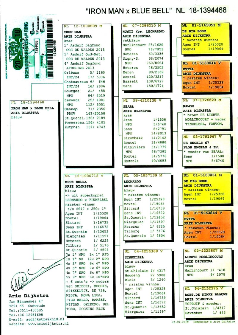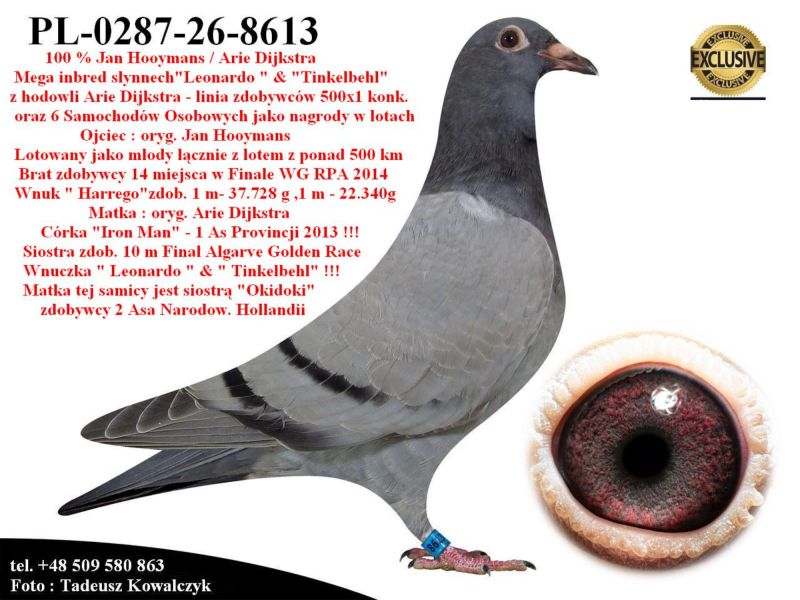 AUKCJA PROMOCYJNA (Cena obowiązuje wyłącznie na tej aukcji) Profesjonalna hodowla z wieloletnim doświadczeniem, posiadająca w swoim stadzie materiał najwyższej światowej klasy, wywodzący się od takich hodowców jak: Jan Hooymans, Gerard Koopman, Mike Ganus, Tjeerd & Jouke Elzinga, Gino Clicque, Jos Vercammen, Jelle Roziers, Bart Geerinckx, Batenburg – v/d Merwe, Altmiks – Pigeons, Jo & Florian Hendriks, Kornelis Winner Loft – linia „Romario”, W & F Ebben, Bert Braspenning, Dirk van den Bulck, Peter v/d Merwe, Jan van de Pasch, Van Elsacker-Jepsen, Roger Desmet – Matthijs, Arie Dijkstra, Leo Heremans, Pieter Veenstra, Gaby Vandenabeele, Karl-Heinz Wichert, Hardy Kruger, Helmut & Alfons Klaas, Gebr. Janssen. Najwyższej klasy materiał hodowlany – najlepsze linie danych Hodowców. Wszystkie wylicytowane gołębie będą dostarczane firmą kurierską.