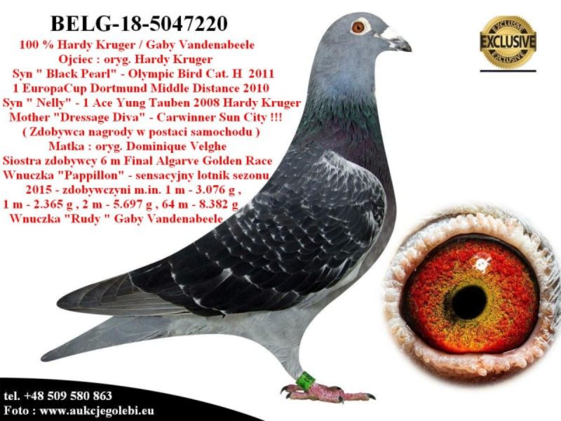 AUKCJA PROMOCYJNA (Cena obowiązuje wyłącznie na tej aukcji) Profesjonalna hodowla z wieloletnim doświadczeniem, posiadająca w swoim stadzie materiał najwyższej światowej klasy, wywodzący się od takich hodowców jak: Jan Hooymans, Gerard Koopman, Mike Ganus, Tjeerd & Jouke Elzinga, Gino Clicque, Jos Vercammen, Jelle Roziers, Bart Geerinckx, Batenburg – v/d Merwe, Altmiks – Pigeons, Jo & Florian Hendriks, Kornelis Winner Loft – linia „Romario”, W & F Ebben, Bert Braspenning, Dirk van den Bulck, Peter v/d Merwe, Jan van de Pasch, Van Elsacker-Jepsen, Roger Desmet – Matthijs, Arie Dijkstra, Leo Heremans, Pieter Veenstra, Gaby Vandenabeele, Karl-Heinz Wichert, Hardy Kruger, Helmut & Alfons Klaas, Gebr. Janssen. Najwyższej klasy materiał hodowlany – najlepsze linie danych Hodowców. Wszystkie wylicytowane gołębie będą dostarczane firmą kurierską.
