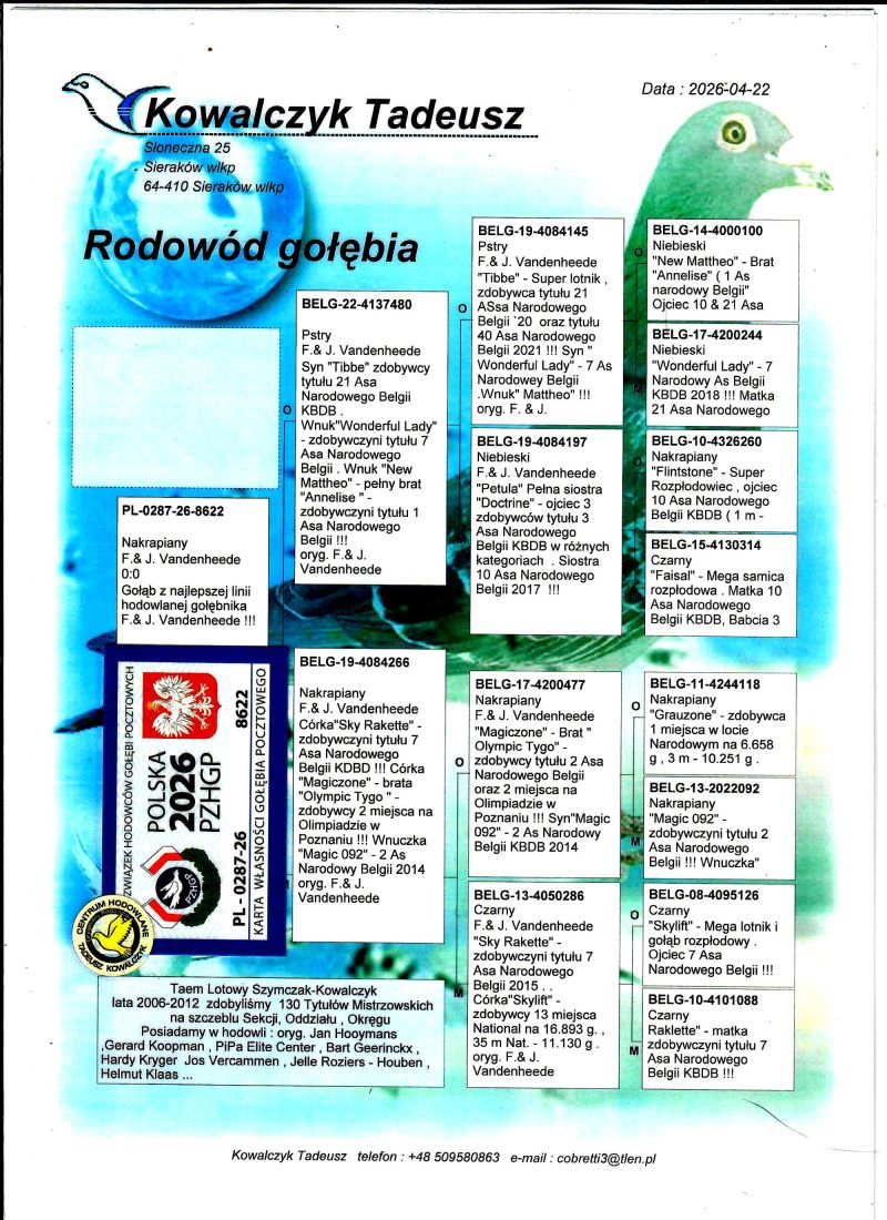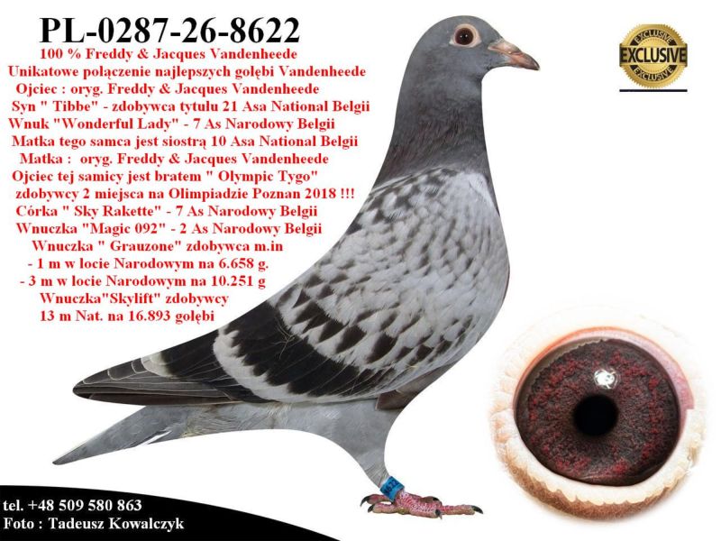 PL-0287-26-8622 Rewelacyjne połączenie najlepszych gołębi z hodowli F.& J. Vandenheede