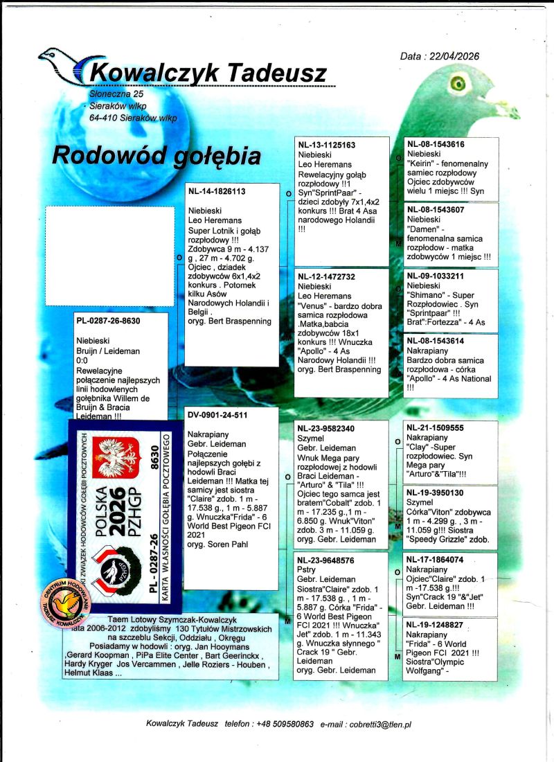 Płeć: młody gołąb Hodowca - rasa: Tadeusz Kowalczyk Zakończenie: 4.05.2026 godz. 21:40