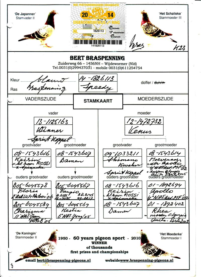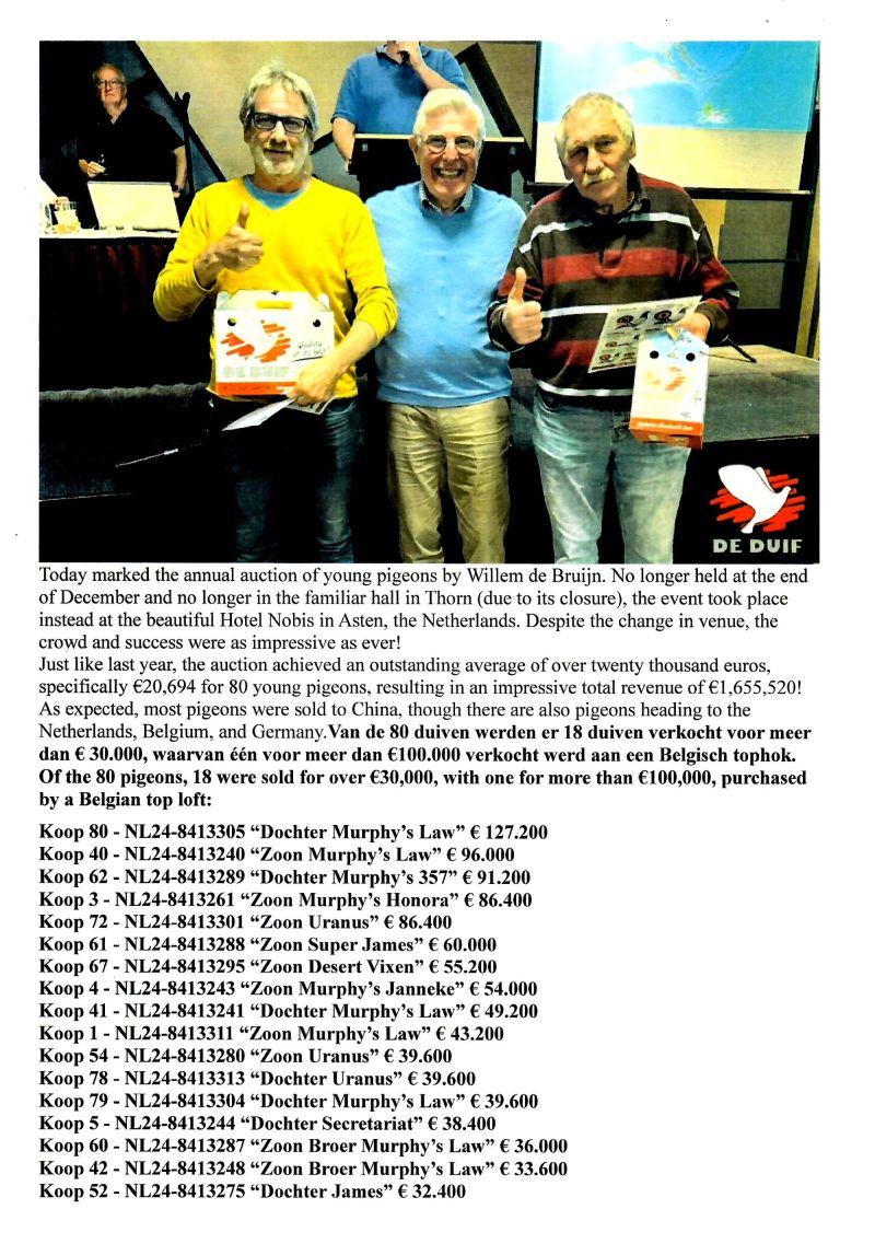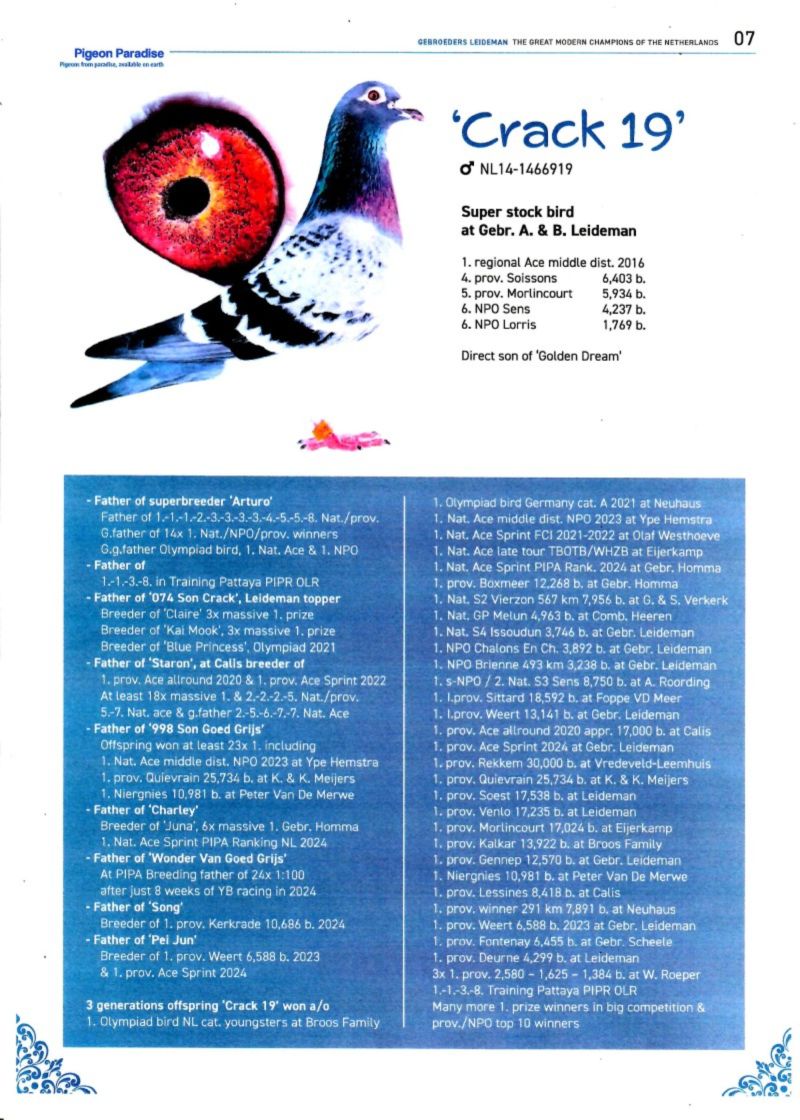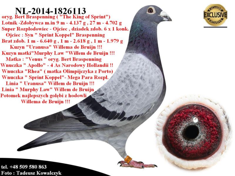 AUKCJA PROMOCYJNA (Cena obowiązuje wyłącznie na tej aukcji) Profesjonalna hodowla z wieloletnim doświadczeniem, posiadająca w swoim stadzie materiał najwyższej światowej klasy, wywodzący się od takich hodowców jak: Jan Hooymans, Gerard Koopman, Mike Ganus, Tjeerd & Jouke Elzinga, Gino Clicque, Jos Vercammen, Jelle Roziers, Bart Geerinckx, Batenburg – v/d Merwe, Altmiks – Pigeons, Jo & Florian Hendriks, Kornelis Winner Loft – linia „Romario”, W & F Ebben, Bert Braspenning, Dirk van den Bulck, Peter v/d Merwe, Jan van de Pasch, Van Elsacker-Jepsen, Roger Desmet – Matthijs, Arie Dijkstra, Leo Heremans, Pieter Veenstra, Gaby Vandenabeele, Karl-Heinz Wichert, Hardy Kruger, Helmut & Alfons Klaas, Gebr. Janssen. Najwyższej klasy materiał hodowlany – najlepsze linie danych Hodowców. Wszystkie wylicytowane gołębie będą dostarczane firmą kurierską.