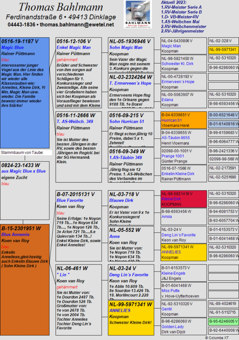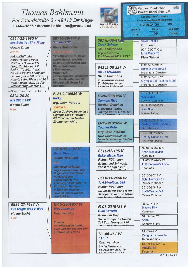 Oryginalny gołąb z hodowli Thomasa Bahlmanna. oferowany gołąb to prawdopodobnie samica. Szczegóły pochodzenia w rodowodzie. Więcej informacji pod nr tel.504780725